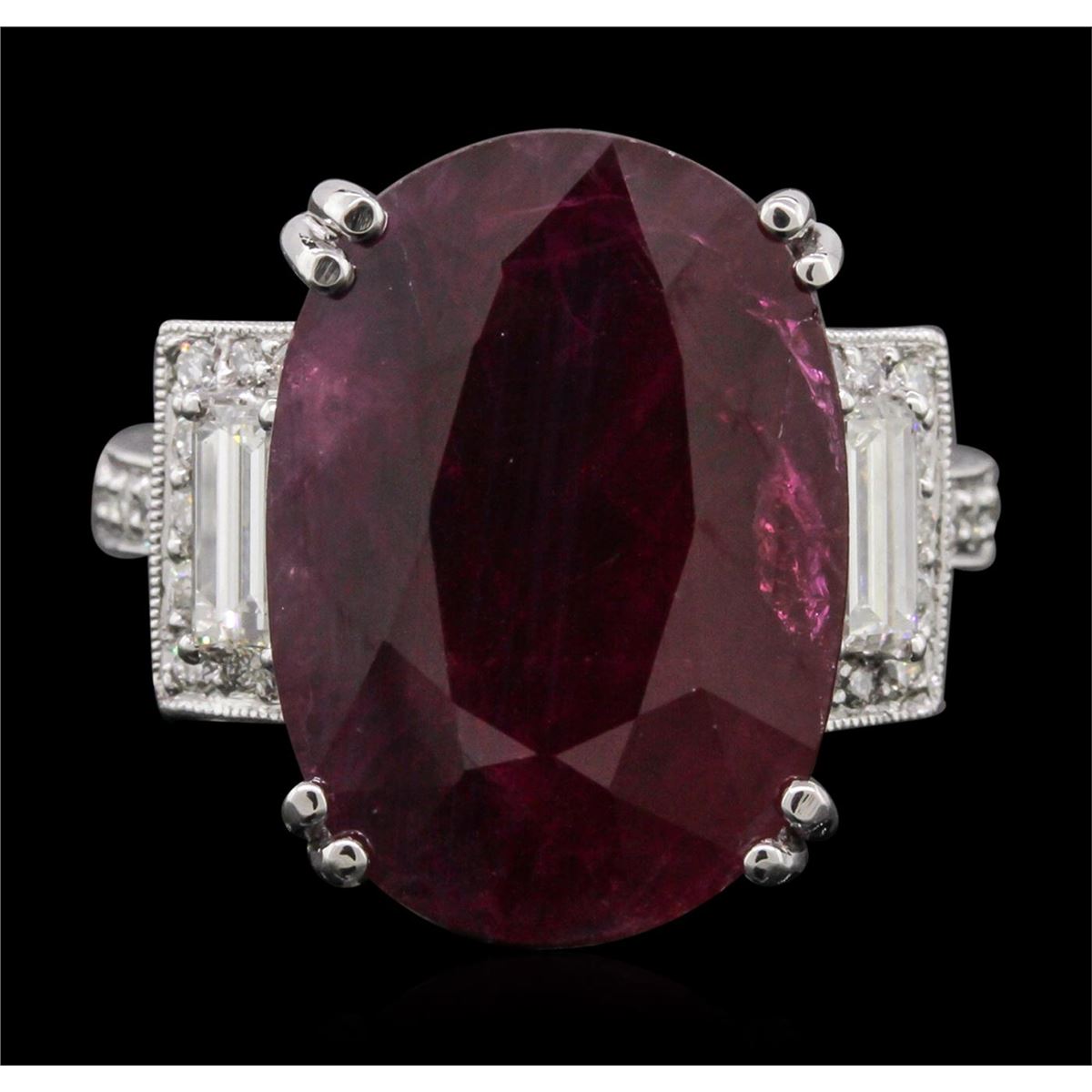 One electronically tested 18KT white gold Ladies combination cast & assembled ring with a bright polish finish. Condition is new. Identified with markings of "18K". Containing: One prong set oval modified mixed cut natural ruby, measuring 18.24 x 13.12 x 6.40mm, approximate weight of 12.59ct., clarity is heavily included, type II, medium dark, moderately strong, strongly purplish red color, (GIA stpR 6/4), cut is good. Indications of heat treatment with glass and flux residue. Colored gemstones are presumed to have been subjected to commonly used color/clarity enhancement processes. Seventy-Six bead set round brilliant cut diamonds, measuring 1.30 - 1.30 x 0.78mm (depth est.) approximate. Total Weight of 76 Stones = 0.61ct. Clarity: SI-1 to SI-2. Color: H - I, Cut is Good. Two prong set baguette cut diamonds, measuring 5.67 x 3.43 x 2.92mm (depth est.) approximate. Total Weight of 2 Stones = 0.30ct. Clarity: VS-2. Color: J, Cut is Very Good. Total Weight of Colored Stones 12.59ct. Total Weight of Diamonds 0.91ct. Total Weight of Ring 12.20 grams. GGL Appraised at $11,015.00.
