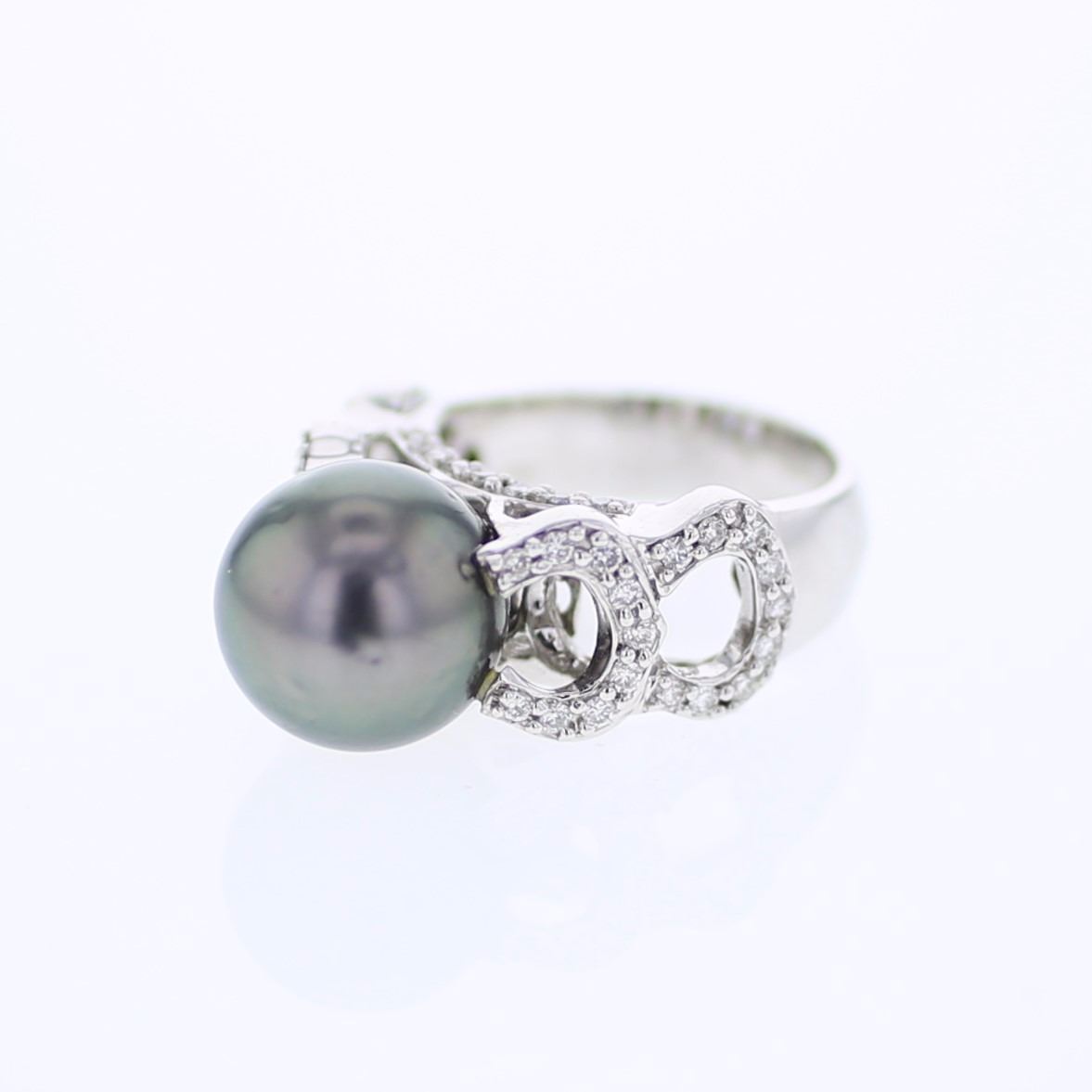 One 18KT White Gold 12.74ct Tahitian Pearl and Diamond Ring. (1) Tahitian Pearl with a total weight of 12.74cts. (20) Round Diamonds with a total weight of 0.58cts. Total weight of this ring is 9.04 grams. Total weight of this ring is 9.04 grams.