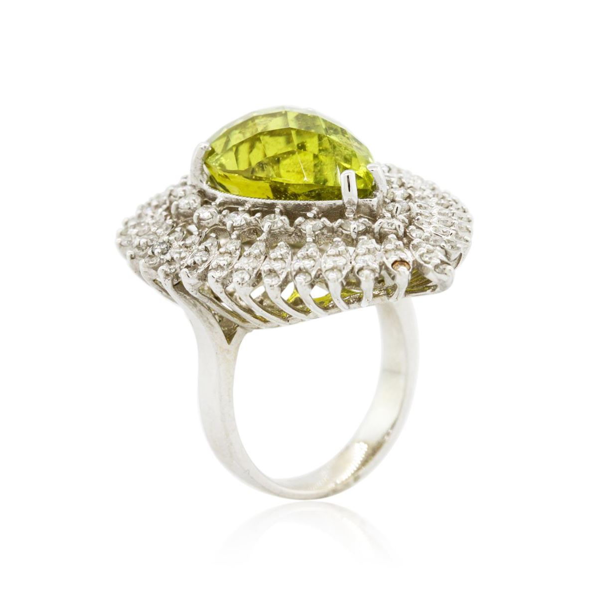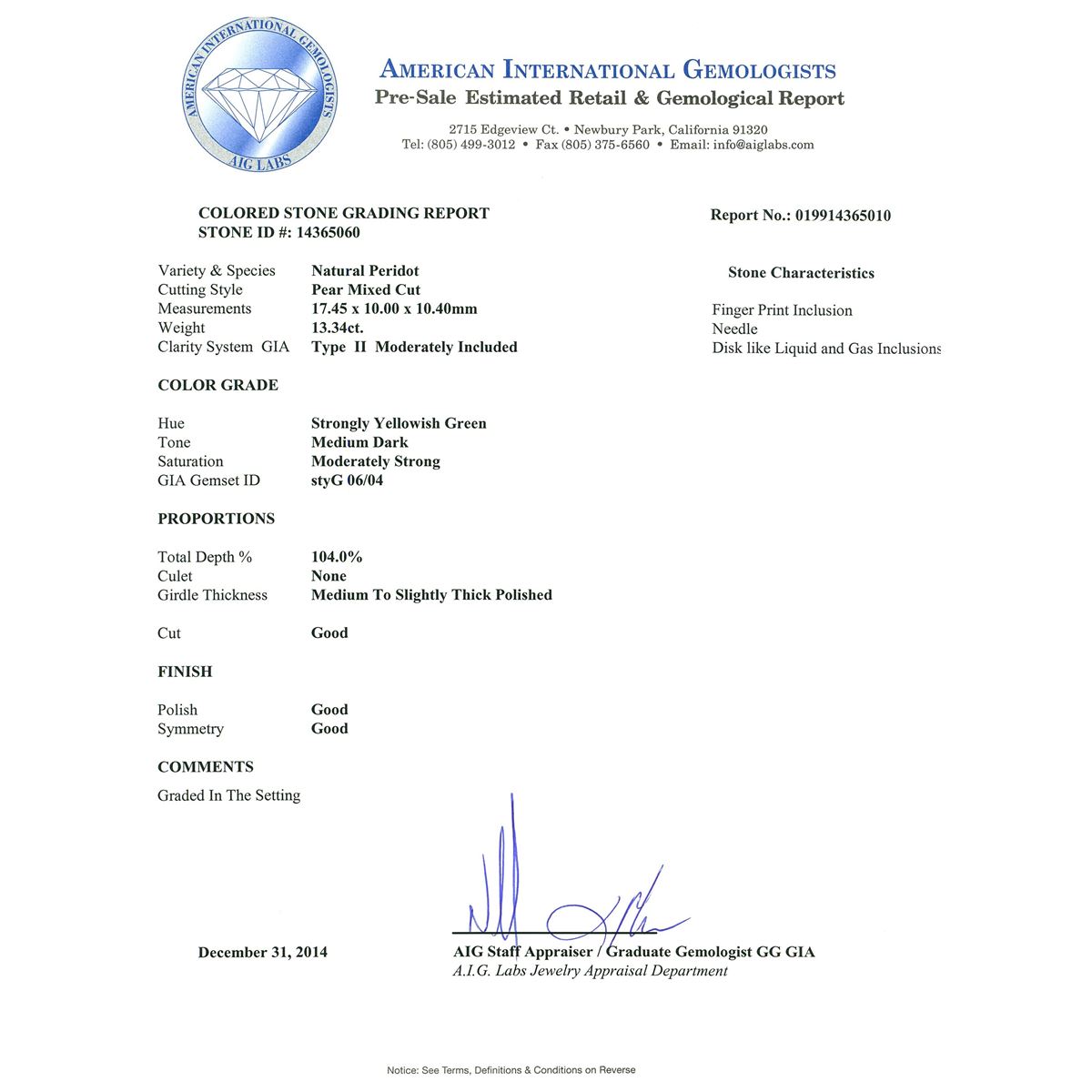 One electronically tested 18KT white gold ladies cast peridot and diamond ring. The featured peridot is set within stylized tiered diamond bezels, completed by a three and one-half millimeter wide band. Bright polish finish with milgrain detailing. Identified with markings of "18K". Condition is new, good workmanship. Containing: One prong set pear mixed cut natural peridot, measuring 17.45 x 10.00 x 10.40mm, 10% bulge factor, approximate weight of 13.34ct., clarity is moderately included, type II, medium dark, moderately strong, strongly yellowish green color, (GIA styG 6/4), cut is good. Transmitting light with a minimum of distortion, transparent. Naturally occurring internal & external characteristics are present. Colored Stone Grading Report attached. Refractive index testing results of 1.65 to 1.69. This is a conclusive result for peridot. Graded in the setting. One Hundred Twenty prong set round brilliant cut diamonds, measuring 1.90 - 1.50 x 1.02mm (depth est.) approximate total weight of 120 Stones = 2.24ct. Graded in the setting. Clarity: SI-2 to I-2. Color: G - I. Total Weight of Colored Stones 13.34ct. Total Weight of Diamonds 2.24ct. Total Weight of Ring 15.50 grams. AIG Appraised at $16,805.00.