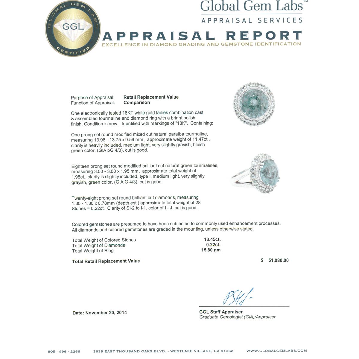 One electronically tested 18KT white gold ladies combination cast & assembled tourmaline and diamond ring with a bright polish finish. Identified with markings of "18K". Condition is new. Containing: One prong set round modified mixed cut natural paraiba tourmaline, measuring 13.98 - 13.75 x 9.59 mm, approximate weight of 11.47ct., clarity is heavily included, medium light, very slightly grayish, bluish green color, (GIA bG 4/3), cut is good. Eighteen prong set round modified brilliant cut natural green tourmalines, measuring 3.00 - 3.00 x 1.95 mm, approximate total weight of 1.98ct., clarity is slightly included, type I, medium light, very slightly grayish, green color, (GIA G 4/3), cut is good. Twenty-Eight prong set round brilliant cut diamonds, measuring 1.30 - 1.30 x 0.78mm (depth est.) approximate total weight of 28 Stones = 0.22ct. Clarity: SI-2 to I-1. Color: I - J, Cut is Good. Colored gemstones are presumed to have been subjected to commonly used enhancement processes. All diamonds and colored gemstones are graded in the mounting, unless otherwise stated. Total Weight of Colored Stones 13.45ct. Total Weight of Diamonds 0.22ct. Total Weight of Ring 15.80 grams. GGL Appraised at $51,080.00.