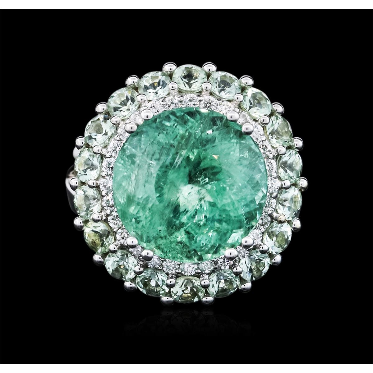 One electronically tested 18KT white gold ladies combination cast & assembled tourmaline and diamond ring with a bright polish finish. Identified with markings of "18K". Condition is new. Containing: One prong set round modified mixed cut natural paraiba tourmaline, measuring 13.98 - 13.75 x 9.59 mm, approximate weight of 11.47ct., clarity is heavily included, medium light, very slightly grayish, bluish green color, (GIA bG 4/3), cut is good. Eighteen prong set round modified brilliant cut natural green tourmalines, measuring 3.00 - 3.00 x 1.95 mm, approximate total weight of 1.98ct., clarity is slightly included, type I, medium light, very slightly grayish, green color, (GIA G 4/3), cut is good. Twenty-Eight prong set round brilliant cut diamonds, measuring 1.30 - 1.30 x 0.78mm (depth est.) approximate total weight of 28 Stones = 0.22ct. Clarity: SI-2 to I-1. Color: I - J, Cut is Good. Colored gemstones are presumed to have been subjected to commonly used enhancement processes. All diamonds and colored gemstones are graded in the mounting, unless otherwise stated. Total Weight of Colored Stones 13.45ct. Total Weight of Diamonds 0.22ct. Total Weight of Ring 15.80 grams. GGL Appraised at $51,080.00.