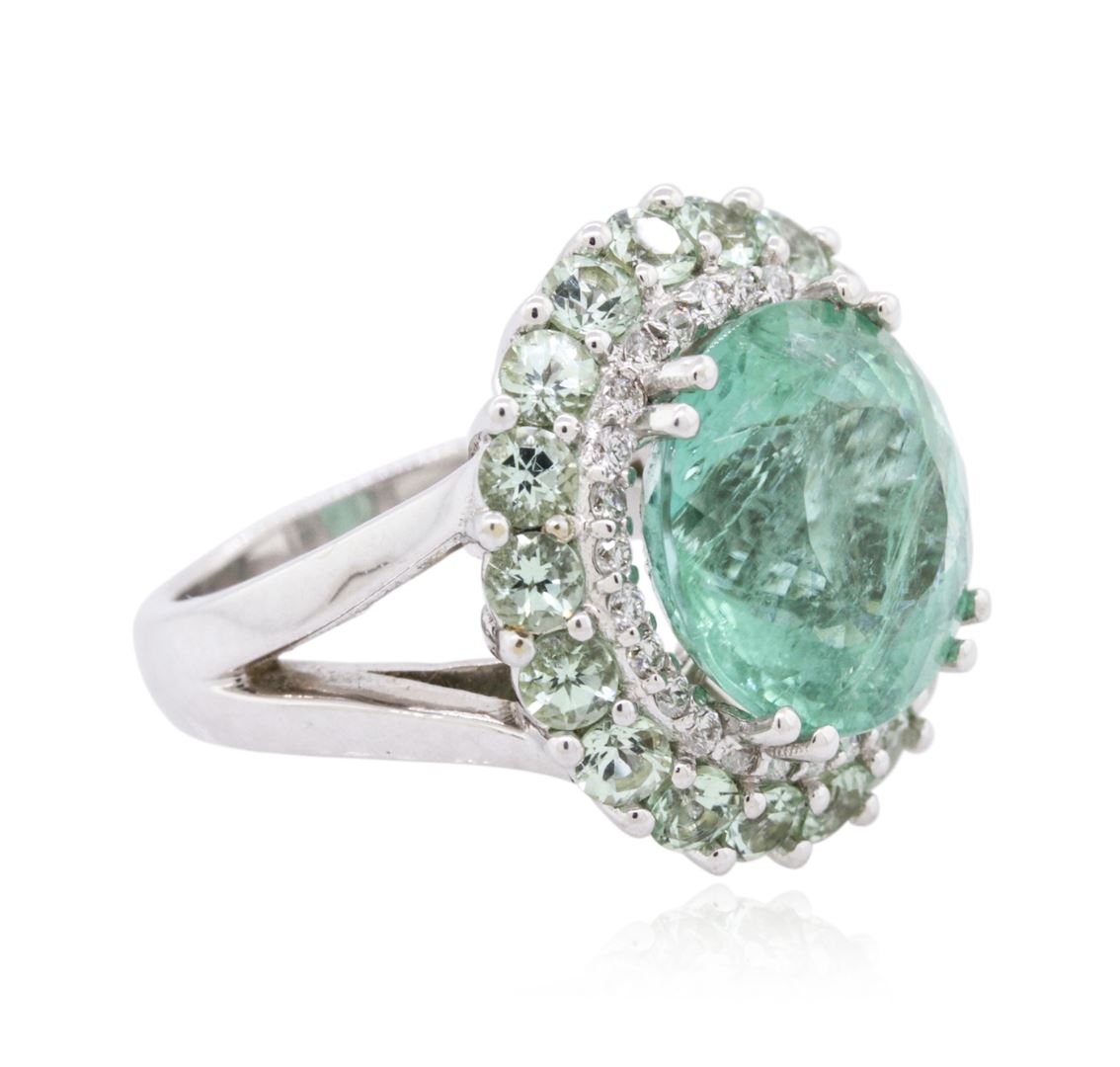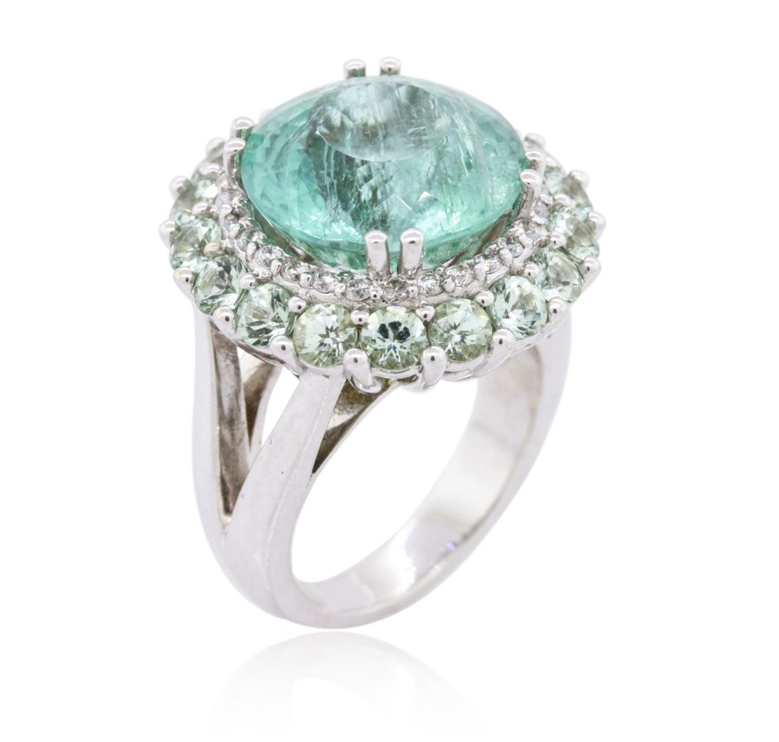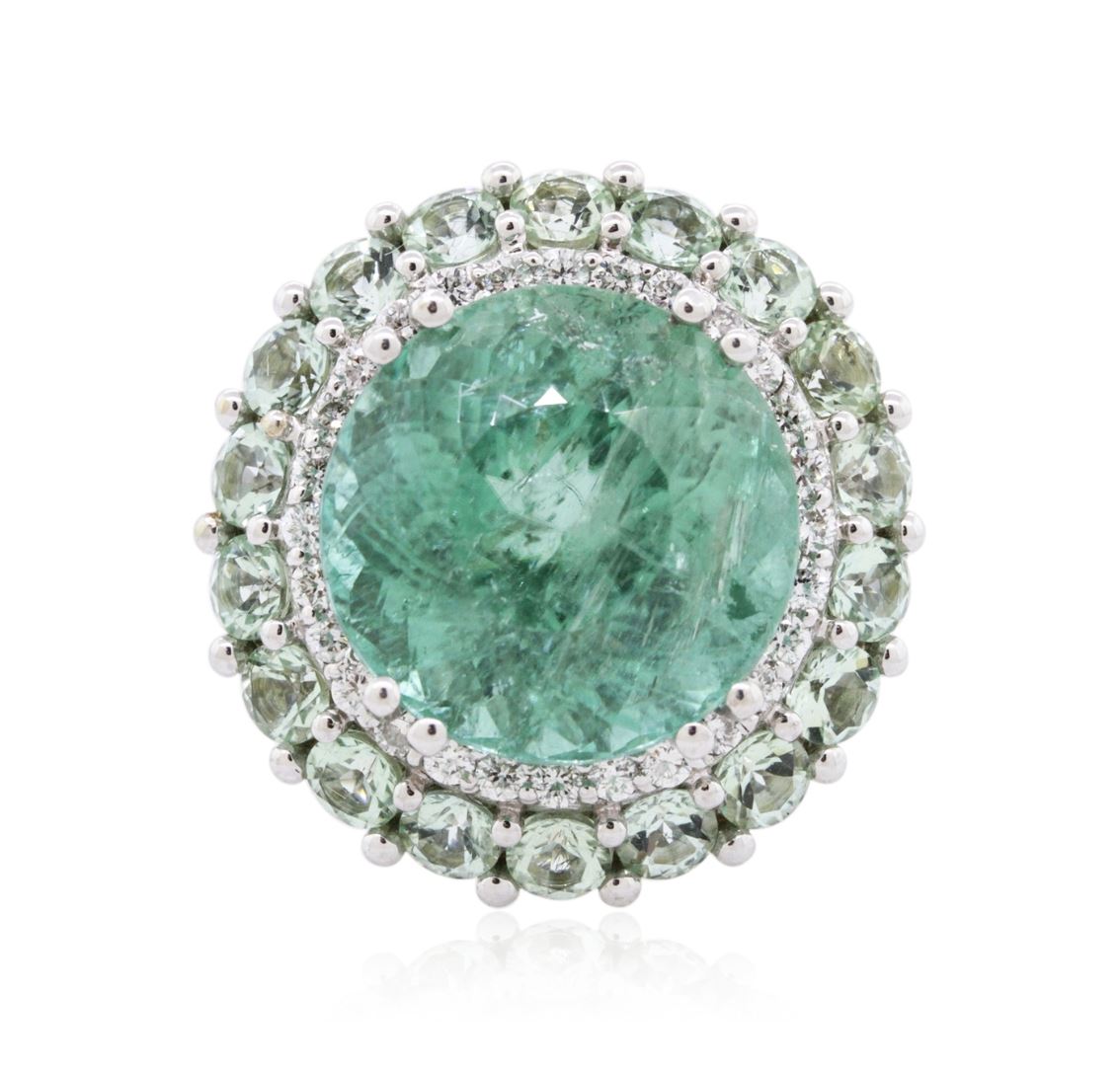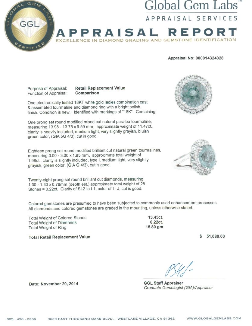 One electronically tested 18KT white gold ladies combination cast & assembled tourmaline and diamond ring with a bright polish finish. Identified with markings of "18K". Condition is new. Containing: One prong set round modified mixed cut natural paraiba tourmaline, measuring 13.98 - 13.75 x 9.59 mm, approximate weight of 11.47ct., clarity is heavily included, medium light, very slightly grayish, bluish green color, (GIA bG 4/3), cut is good. Eighteen prong set round modified brilliant cut natural green tourmalines, measuring 3.00 - 3.00 x 1.95 mm, approximate total weight of 1.98ct., clarity is slightly included, type I, medium light, very slightly grayish, green color, (GIA G 4/3), cut is good. Twenty-Eight prong set round brilliant cut diamonds, measuring 1.30 - 1.30 x 0.78mm (depth est.) approximate total weight of 28 Stones = 0.22ct. Clarity: SI-2 to I-1. Color: I - J, Cut is Good. Colored gemstones are presumed to have been subjected to commonly used enhancement processes. All diamonds and colored gemstones are graded in the mounting, unless otherwise stated. Total Weight of Colored Stones 13.45ct. Total Weight of Diamonds 0.22ct. Total Weight of Ring 15.80 grams. GGL Appraised at $51,080.00.