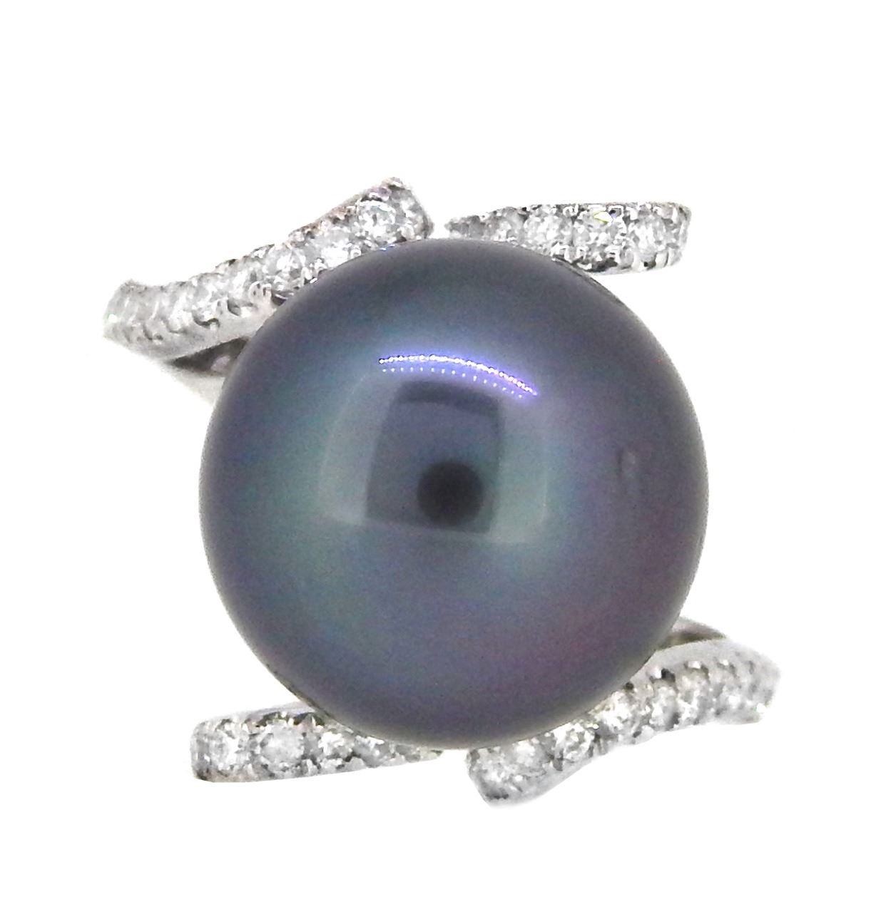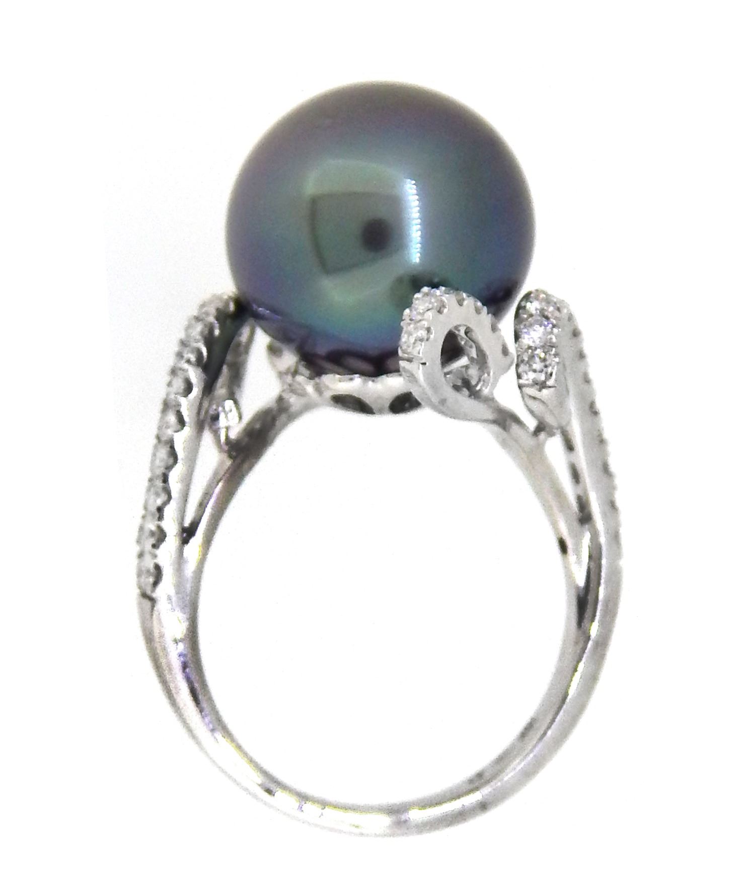 One 18KT White Gold 13mm Tahitian Pearl and Diamond Ring. (1) Tahitian Pearl measuring 13mm. (38) Diamonds with a total weight of 0.61cts with a color of F-G and clarity of SI-1 to SI-2. Total weight of this ring is 8.0 grams.