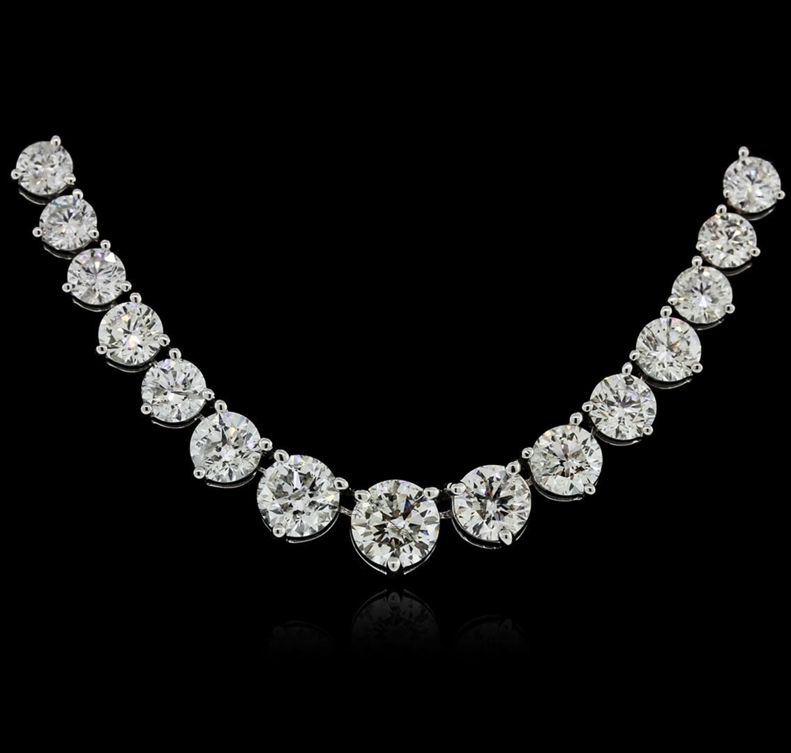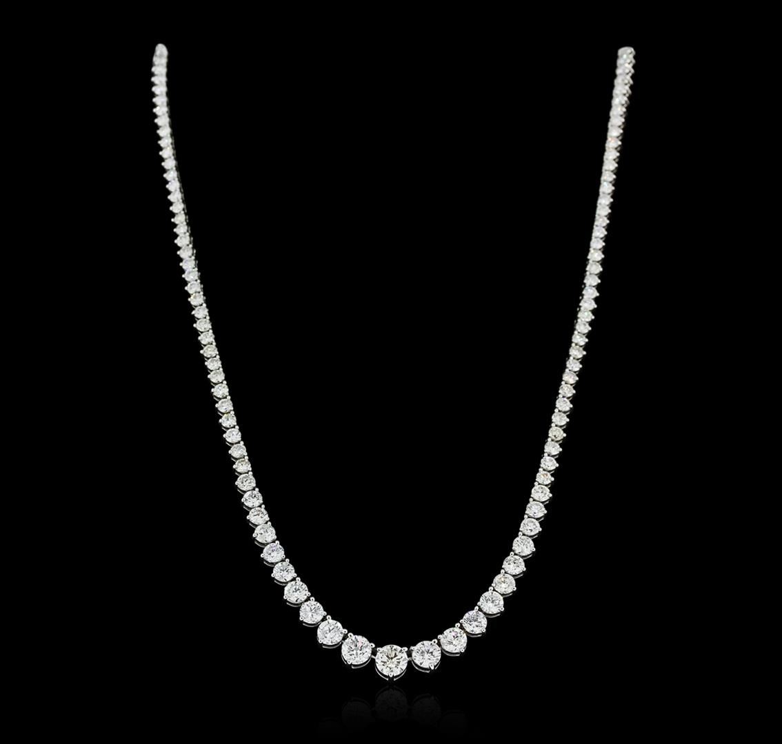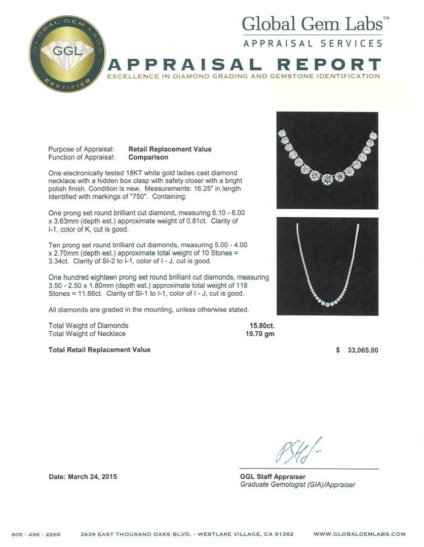 One electronically tested 18KT white gold ladies cast diamond necklace with a hidden box clasp with safety closer with a bright polish finish. Measurements: 16.25" in length Identified with markings of "750". Condition is new. Containing: One prong set round brilliant cut diamond, measuring 6.10 - 6.00 x 3.63mm (depth est.) approximate weight of 0.81ct. Clarity: I-1. Color: K, Cut is Good. Ten prong set round brilliant cut diamonds, measuring 5.00 - 4.00 x 2.70mm (depth est.) approximate total weight of 10 Stones = 3.34ct. Clarity: SI-2 to I-1. Color: I - J, Cut is Good. One Hundred Eighteen prong set round brilliant cut diamonds, measuring 3.50 - 2.50 x 1.80mm (depth est.) approximate total weight of 118 Stones = 11.66ct. Clarity: SI-1 to I-1. Color: I - J, Cut is Good. All diamonds are graded in the mounting, unless otherwise stated. Total Weight of Diamonds 15.80ct. Total Weight of Necklace 19.70 grams. GGL Appraised at $33,065.00.