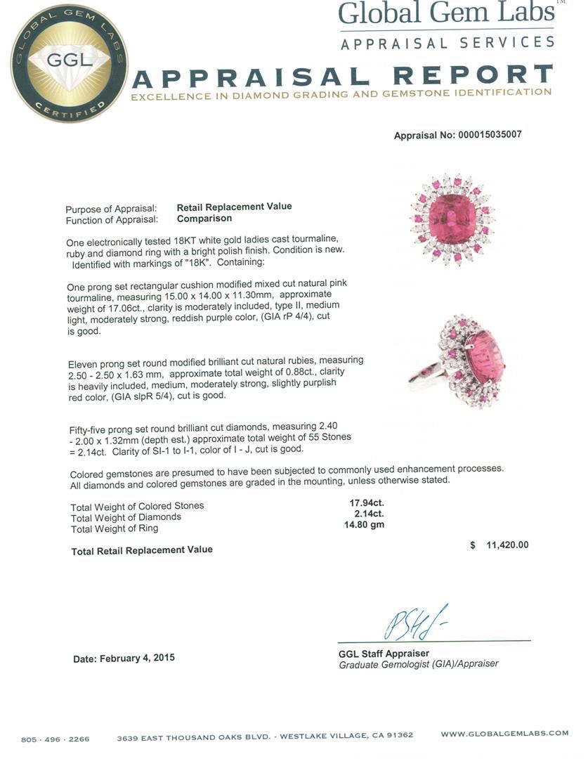 One electronically tested 18KT white gold ladies cast tourmaline, ruby and diamond ring with a bright polish finish. Identified with markings of "18K". Condition is new. Containing: One prong set rectangular cushion modified mixed cut natural pink tourmaline, measuring 15.00 x 14.00 x 11.30mm, approximate weight of 17.06ct., clarity is moderately included, type II, medium light, moderately strong, reddish purple color, (GIA rP 4/4), cut is good. Eleven prong set round modified brilliant cut natural rubies, measuring 2.50 - 2.50 x 1.63 mm, approximate total weight of 0.88ct., clarity is heavily included, medium, moderately strong, slightly purplish red color, (GIA slpR 5/4), cut is good. Fifty-Five prong set round brilliant cut diamonds, measuring 2.40 - 2.00 x 1.32mm (depth est.) approximate total weight of 55 Stones = 2.14ct. Clarity: SI-1 to I-1. Color: I - J, Cut is Good. Colored gemstones are presumed to have been subjected to commonly used enhancement processes. All diamonds and colored gemstones are graded in the mounting, unless otherwise stated. Total Weight of Colored Stones 17.94ct. Total Weight of Diamonds 2.14ct. Total Weight of Ring 14.80 grams. GGL Appraised at $11,420.00.
