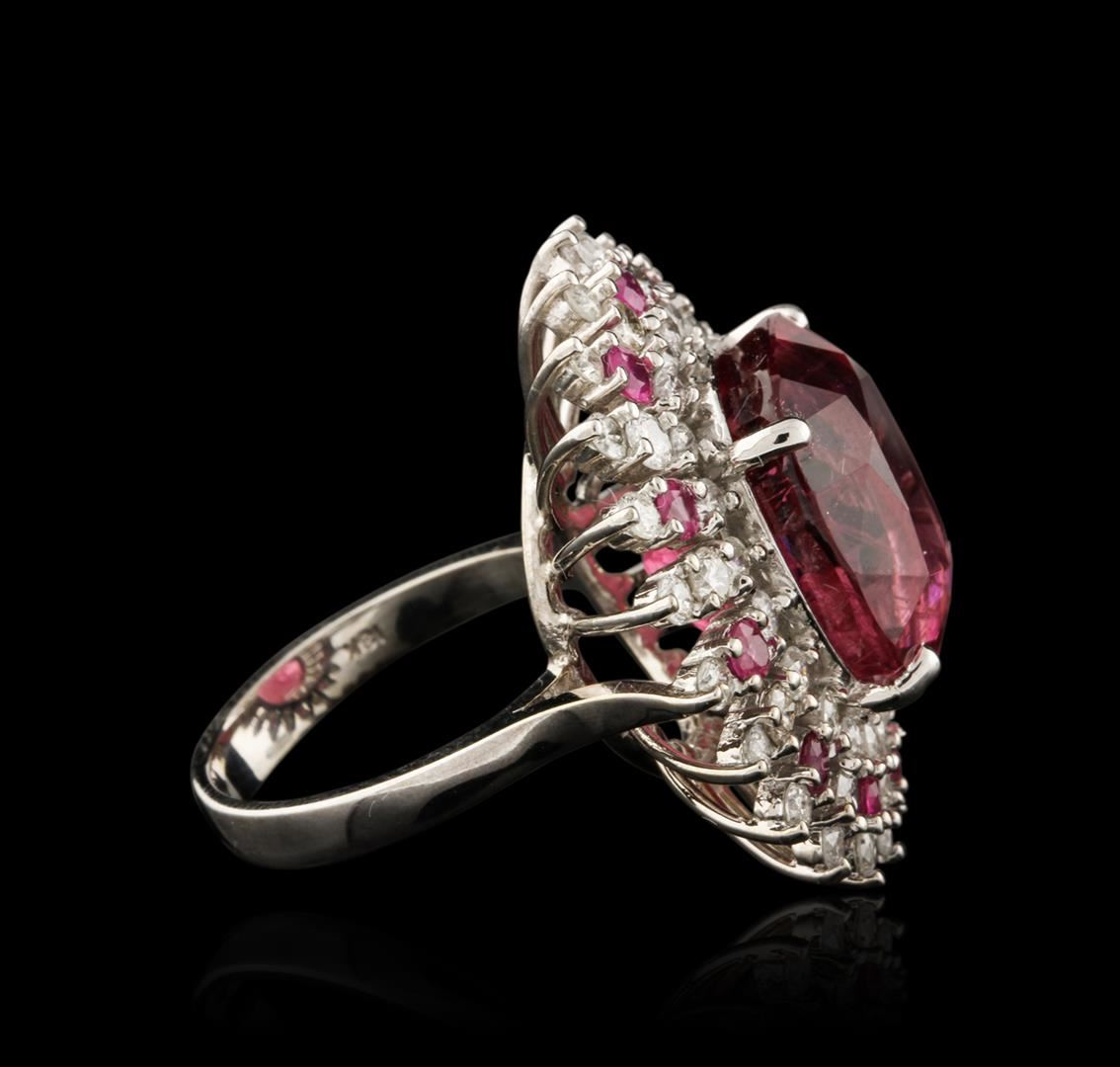 One electronically tested 18KT white gold ladies cast tourmaline, ruby and diamond ring with a bright polish finish. Identified with markings of "18K". Condition is new. Containing: One prong set rectangular cushion modified mixed cut natural pink tourmaline, measuring 15.00 x 14.00 x 11.30mm, approximate weight of 17.06ct., clarity is moderately included, type II, medium light, moderately strong, reddish purple color, (GIA rP 4/4), cut is good. Eleven prong set round modified brilliant cut natural rubies, measuring 2.50 - 2.50 x 1.63 mm, approximate total weight of 0.88ct., clarity is heavily included, medium, moderately strong, slightly purplish red color, (GIA slpR 5/4), cut is good. Fifty-Five prong set round brilliant cut diamonds, measuring 2.40 - 2.00 x 1.32mm (depth est.) approximate total weight of 55 Stones = 2.14ct. Clarity: SI-1 to I-1. Color: I - J, Cut is Good. Colored gemstones are presumed to have been subjected to commonly used enhancement processes. All diamonds and colored gemstones are graded in the mounting, unless otherwise stated. Total Weight of Colored Stones 17.94ct. Total Weight of Diamonds 2.14ct. Total Weight of Ring 14.80 grams. GGL Appraised at $11,420.00.