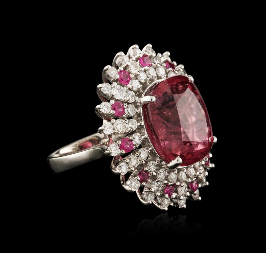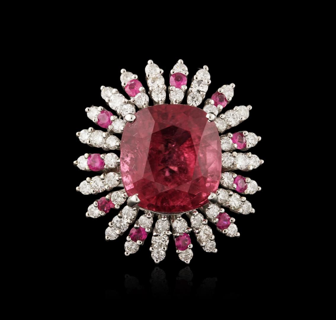 One electronically tested 18KT white gold ladies cast tourmaline, ruby and diamond ring with a bright polish finish. Identified with markings of "18K". Condition is new. Containing: One prong set rectangular cushion modified mixed cut natural pink tourmaline, measuring 15.00 x 14.00 x 11.30mm, approximate weight of 17.06ct., clarity is moderately included, type II, medium light, moderately strong, reddish purple color, (GIA rP 4/4), cut is good. Eleven prong set round modified brilliant cut natural rubies, measuring 2.50 - 2.50 x 1.63 mm, approximate total weight of 0.88ct., clarity is heavily included, medium, moderately strong, slightly purplish red color, (GIA slpR 5/4), cut is good. Fifty-Five prong set round brilliant cut diamonds, measuring 2.40 - 2.00 x 1.32mm (depth est.) approximate total weight of 55 Stones = 2.14ct. Clarity: SI-1 to I-1. Color: I - J, Cut is Good. Colored gemstones are presumed to have been subjected to commonly used enhancement processes. All diamonds and colored gemstones are graded in the mounting, unless otherwise stated. Total Weight of Colored Stones 17.94ct. Total Weight of Diamonds 2.14ct. Total Weight of Ring 14.80 grams. GGL Appraised at $11,420.00.