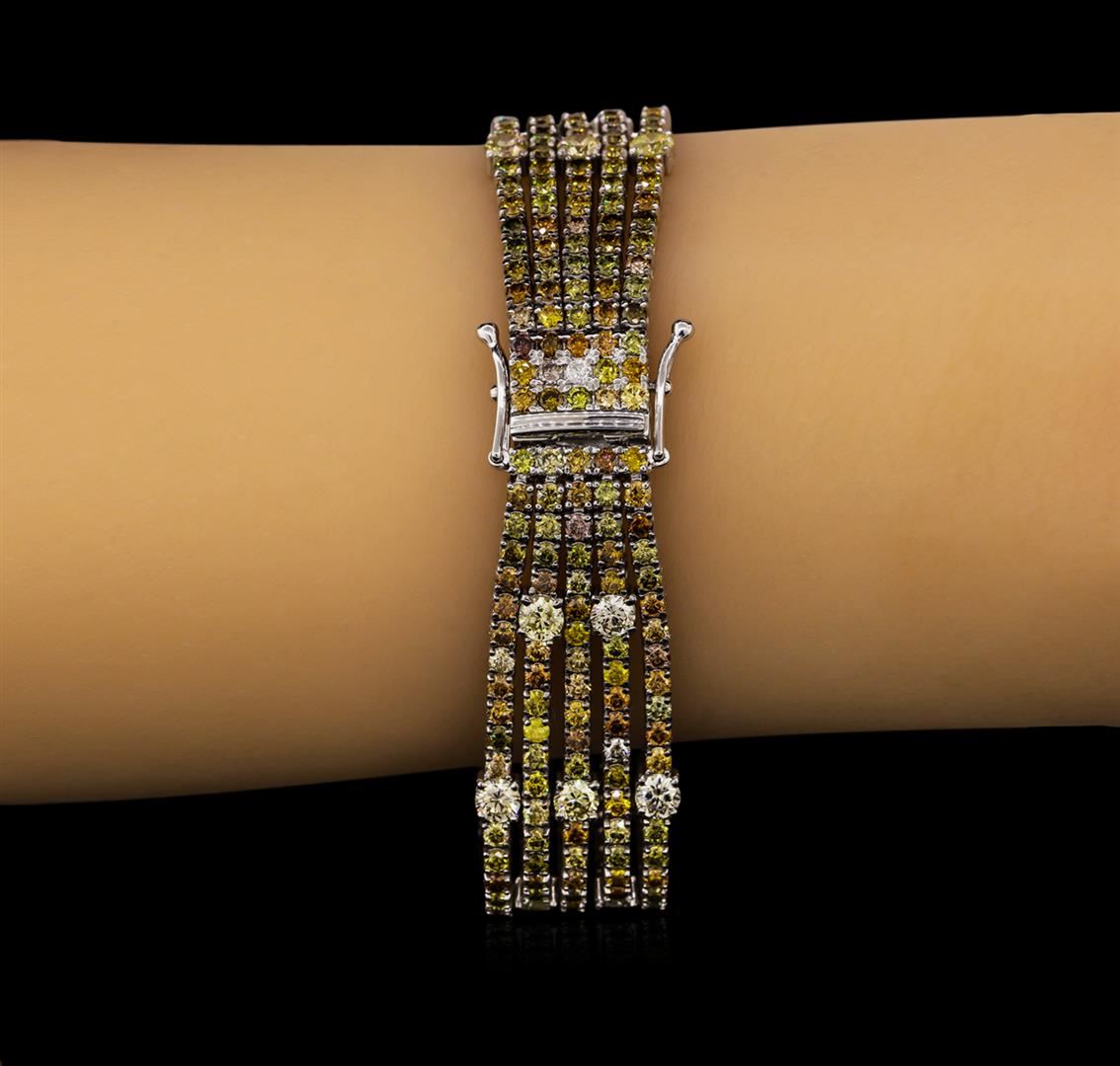 One electronically tested 18KT white gold ladies cast & assembled diamond bracelet with a bright polish finish. Condition is new, good workmanship. Seven inch length bracelet features multiple ribbons of diamonds terminating in a concealed clasp with twin safeties. Identified with markings of "750". Containing: Three hundred sixty-one prong set round brilliant cut diamonds, measuring 3.80 - 2.10 x 1.77mm (depth est.) approximate total weight of 361 Stones = 19.79ct. The group is composed of a mix of natural fancy and irradiated fancy color diamonds ranging from very light yellow to fancy yellow to fancy brown diamonds. Graded in the setting. Clarity SI-2 to I-2. Total Weight of Diamonds: 19.79ct. Total Weight of Bracelet: 37.40gm. US! AIG Appraised at $48,925.00.