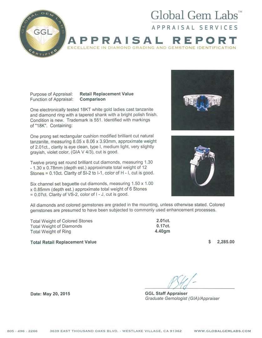 One electronically tested 18KT white gold ladies cast tanzanite and diamond ring with a tapered shank with a bright polish finish. Trademark is 551. Identified with markings of "18K". Condition is new. Containing: One prong set rectangular cushion modified brilliant cut natural tanzanite, measuring 8.05 x 8.06 x 3.93mm, approximate weight of 2.01ct., clarity is eye clean, type I, medium light, very slightly grayish, violet color, (GIA V 4/3), cut is good. Twelve prong set round brilliant cut diamonds, measuring 1.30 - 1.30 x 0.78mm (depth est.) approximate total weight of 12 Stones = 0.10ct. Clarity: SI-2 to I-1. Color: H - I, Cut is Good. Six channel set baguette cut diamonds, measuring 1.50 x 1.00 x 0.85mm (depth est.) approximate total weight of 6 Stones = 0.07ct. Clarity: VS-2. Color: I - J, Cut is Good. All diamonds and colored gemstones are graded in the mounting, unless otherwise stated. Colored gemstones are presumed to have been subjected to commonly used enhancement processes. Total Weight of Colored Stones 2.01ct. Total Weight of Diamonds 0.17ct. Total Weight of Ring 4.40 grams. GGL Appraised at $2,285.00.