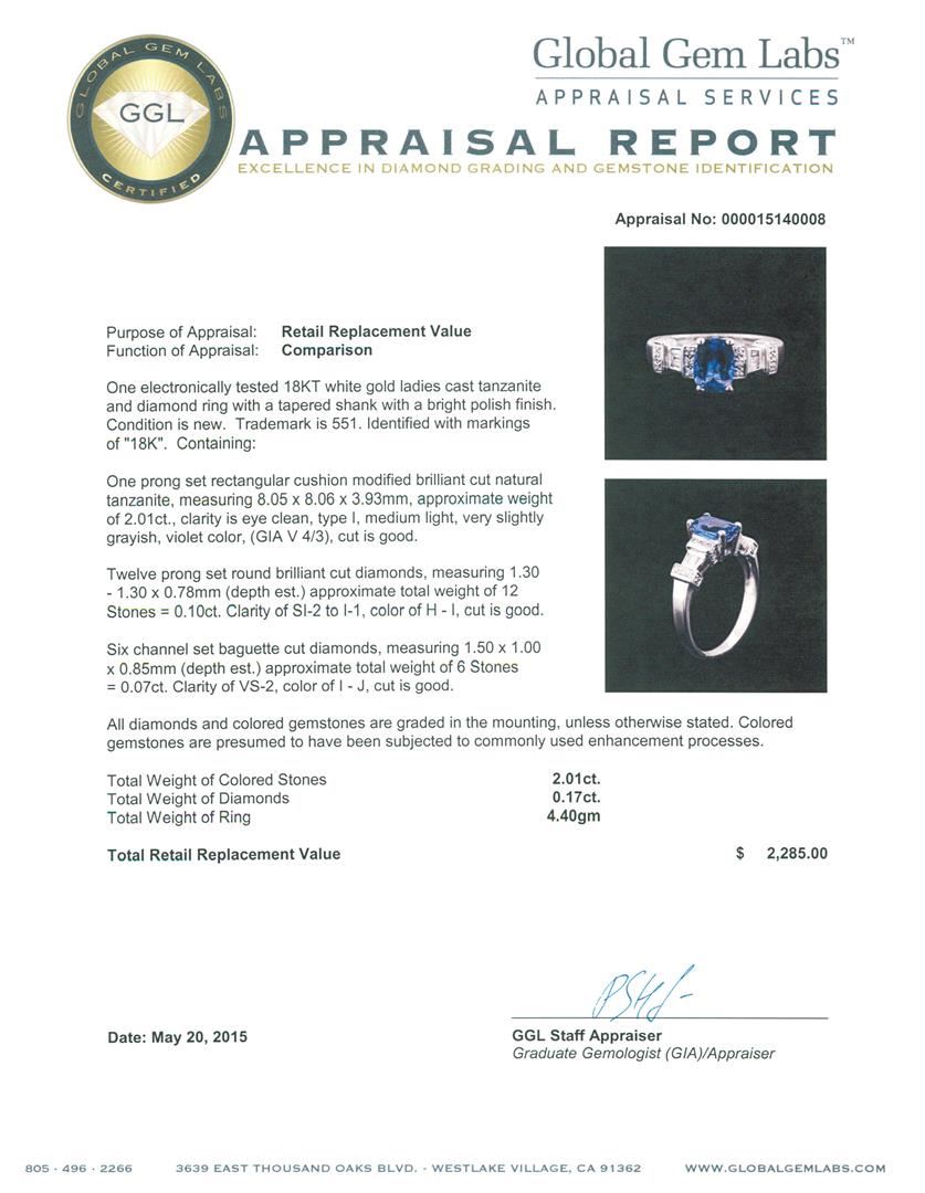 One electronically tested 18KT white gold ladies cast tanzanite and diamond ring with a tapered shank with a bright polish finish. Trademark is 551. Identified with markings of "18K". Condition is new. Containing: One prong set rectangular cushion modified brilliant cut natural tanzanite, measuring 8.05 x 8.06 x 3.93mm, approximate weight of 2.01ct., clarity is eye clean, type I, medium light, very slightly grayish, violet color, (GIA V 4/3), cut is good. Twelve prong set round brilliant cut diamonds, measuring 1.30 - 1.30 x 0.78mm (depth est.) approximate total weight of 12 Stones = 0.10ct. Clarity: SI-2 to I-1. Color: H - I, Cut is Good. Six channel set baguette cut diamonds, measuring 1.50 x 1.00 x 0.85mm (depth est.) approximate total weight of 6 Stones = 0.07ct. Clarity: VS-2. Color: I - J, Cut is Good. All diamonds and colored gemstones are graded in the mounting, unless otherwise stated. Colored gemstones are presumed to have been subjected to commonly used enhancement processes. Total Weight of Colored Stones 2.01ct. Total Weight of Diamonds 0.17ct. Total Weight of Ring 4.40 grams. GGL Appraised at $2,285.00.
