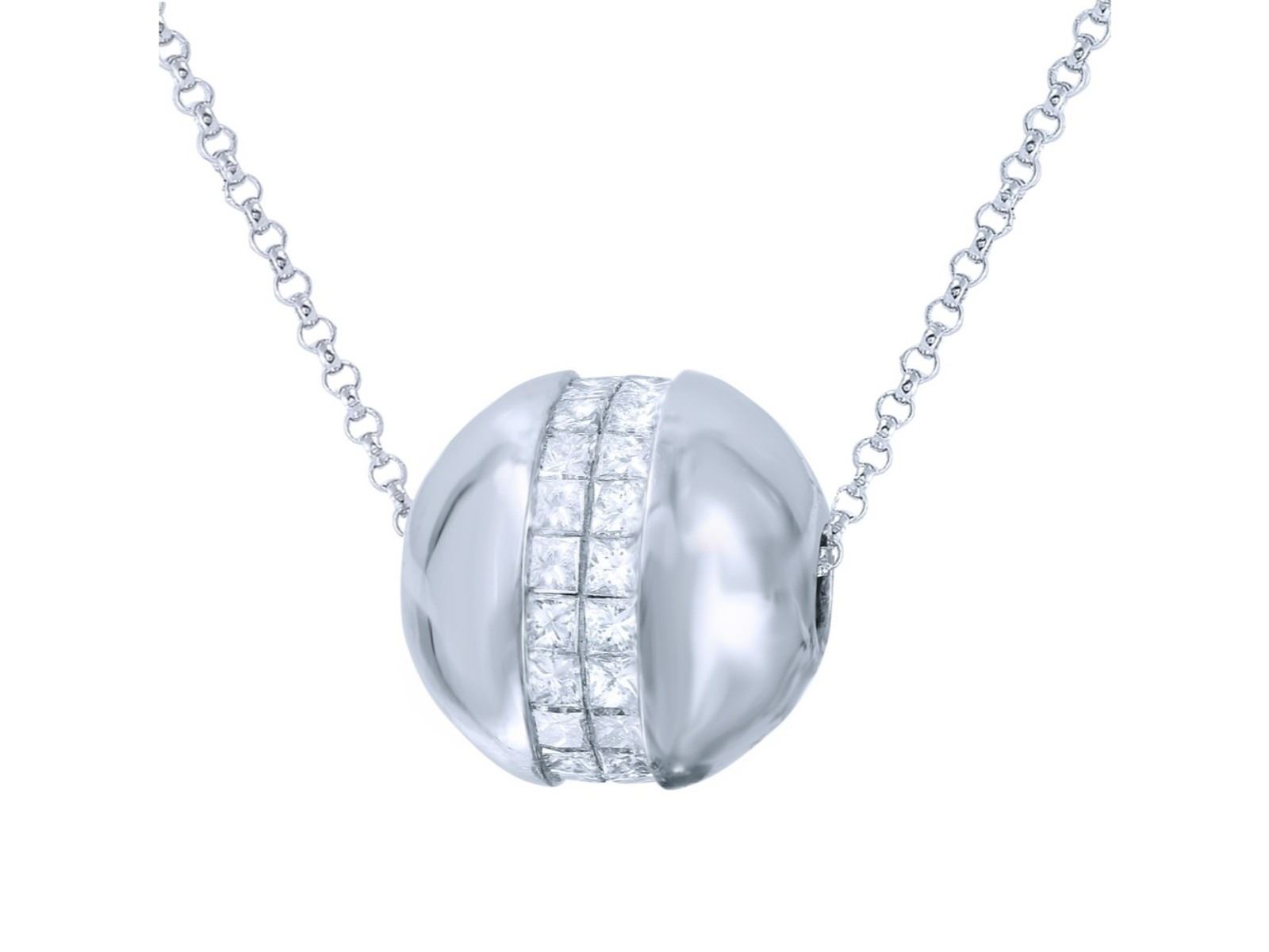 One 18KT White Gold 2.02ctw Diamond Pendant with Chain. (42) princess cut Diamonds with a total weight of 2.02cts with a color of I and clarity of I-1. Total weight of this pendant with chain is 11.9 grams.