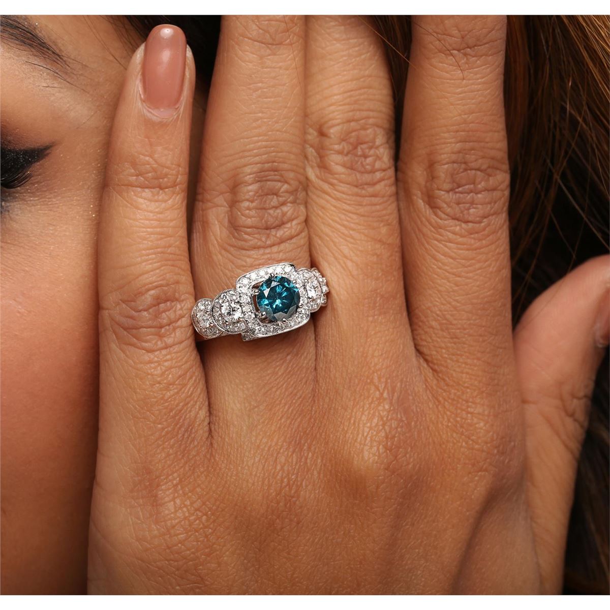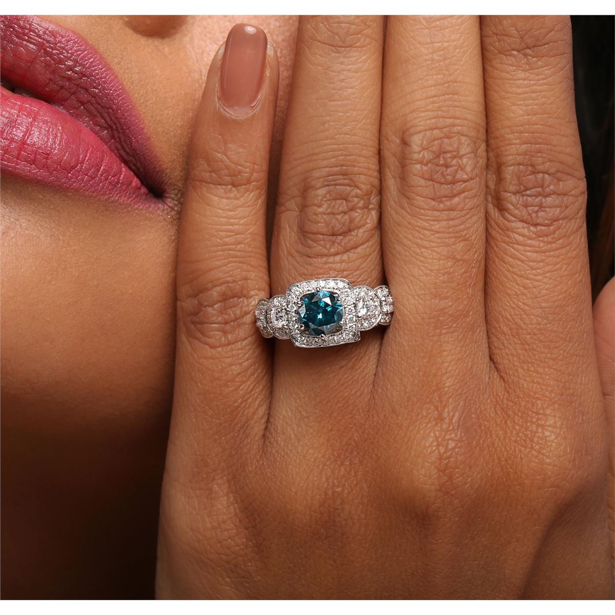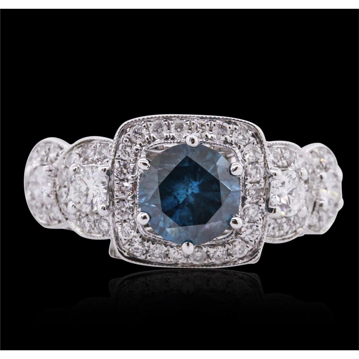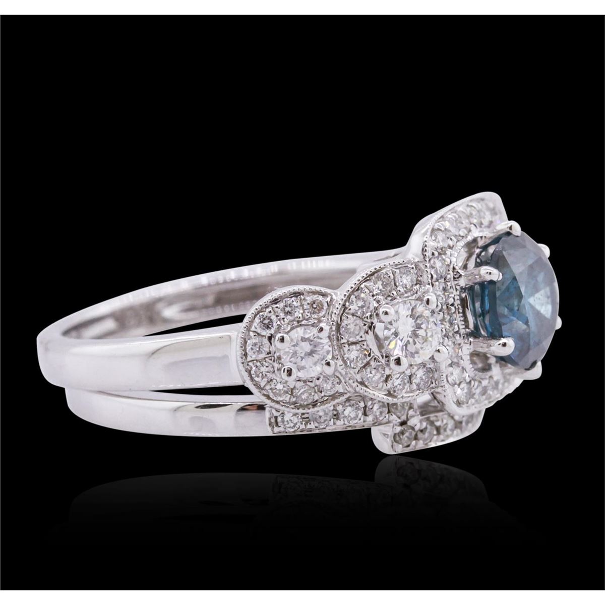 One wedding ring set featuring: 18KT white gold weighing 7.65 grams containing one blue diamond center stone with a total weight of 1.22ct and 75 round diamonds with a total weight of 0.85cts.