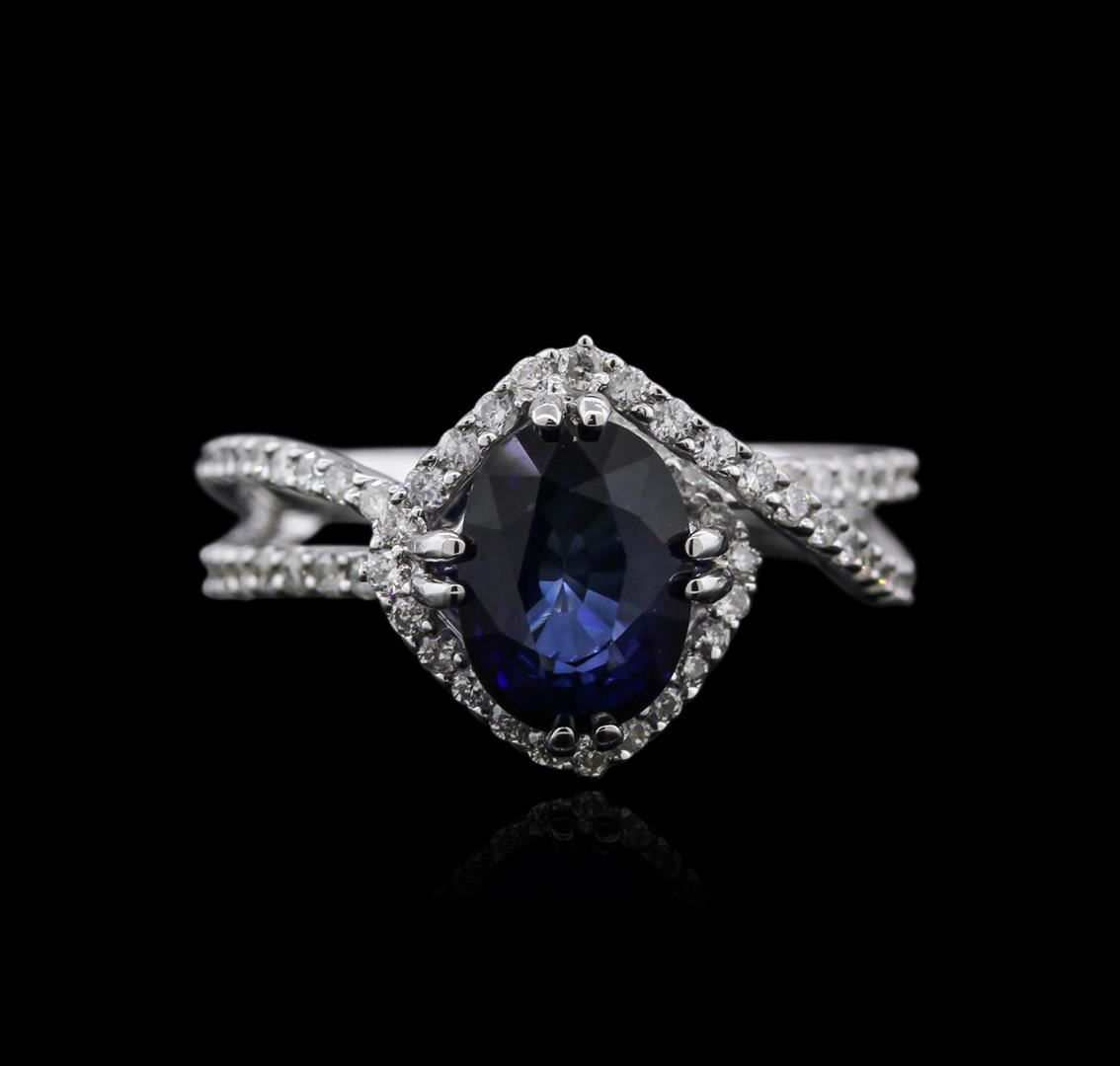 One electronically tested 18KT white gold ladies cast sapphire and diamond ring with a bright polish finish. Identified with markings of "18K". Condition is new. Containing: One prong set oval modified brilliant cut natural blue sapphire, measuring 9.00 x 6.50 x 4.23mm, approximate weight of 2.08ct., clarity is eye clean, type II, medium, moderately strong, blue color, (GIA B 5/4), cut is good. Seventy-Two prong set round brilliant cut diamonds, measuring 1.20 - 1.20 x 0.72mm (depth est.) approximate total weight of 72 Stones = 0.45ct. Clarity: SI-2 to I-1. Color: I - J, Cut is Good. Colored gemstones are presumed to have been subjected to commonly used enhancement processes. All diamonds and colored gemstones are graded in the mounting, unless otherwise stated. Total Weight of Colored Stones 2.08ct. Total Weight of Diamonds 0.45ct. Total Weight of Ring 5.50 grams. GGL Appraised at $6,815.00.