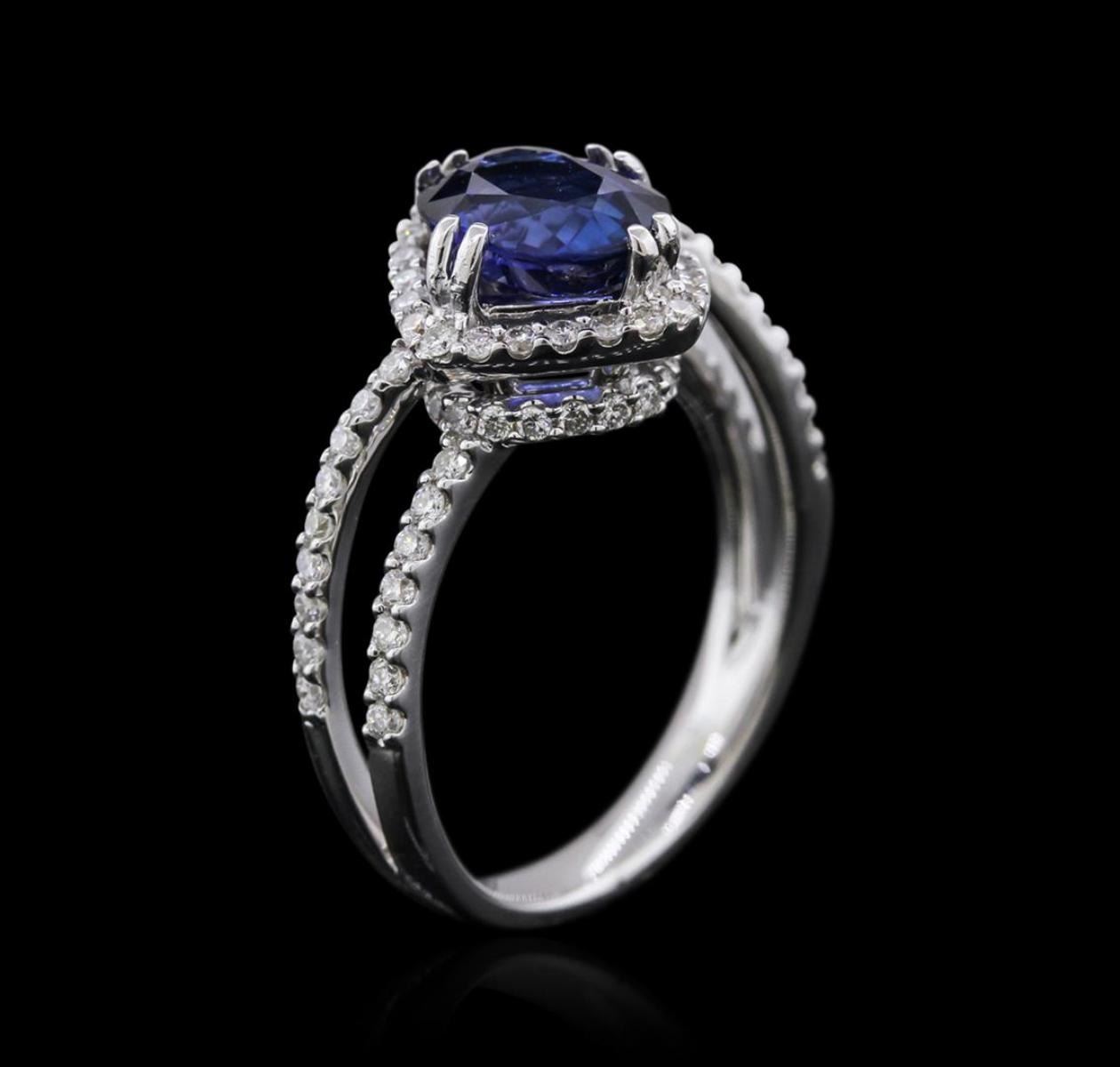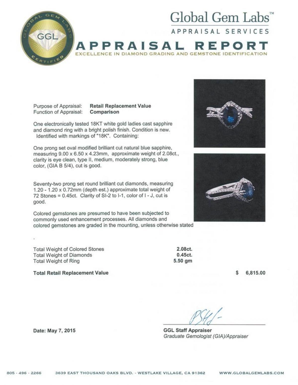 One electronically tested 18KT white gold ladies cast sapphire and diamond ring with a bright polish finish. Identified with markings of "18K". Condition is new. Containing: One prong set oval modified brilliant cut natural blue sapphire, measuring 9.00 x 6.50 x 4.23mm, approximate weight of 2.08ct., clarity is eye clean, type II, medium, moderately strong, blue color, (GIA B 5/4), cut is good. Seventy-Two prong set round brilliant cut diamonds, measuring 1.20 - 1.20 x 0.72mm (depth est.) approximate total weight of 72 Stones = 0.45ct. Clarity: SI-2 to I-1. Color: I - J, Cut is Good. Colored gemstones are presumed to have been subjected to commonly used enhancement processes. All diamonds and colored gemstones are graded in the mounting, unless otherwise stated. Total Weight of Colored Stones 2.08ct. Total Weight of Diamonds 0.45ct. Total Weight of Ring 5.50 grams. GGL Appraised at $6,815.00.