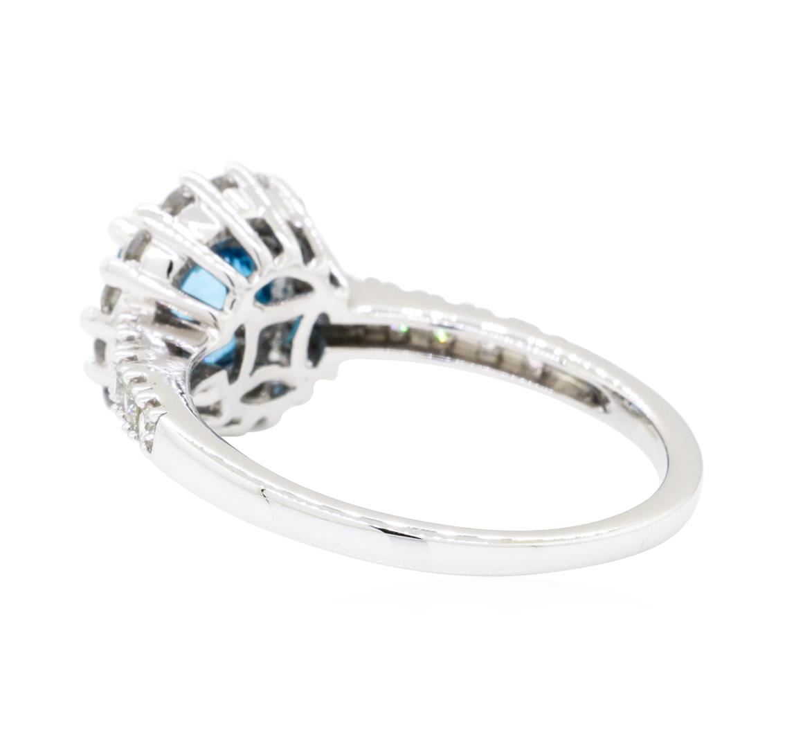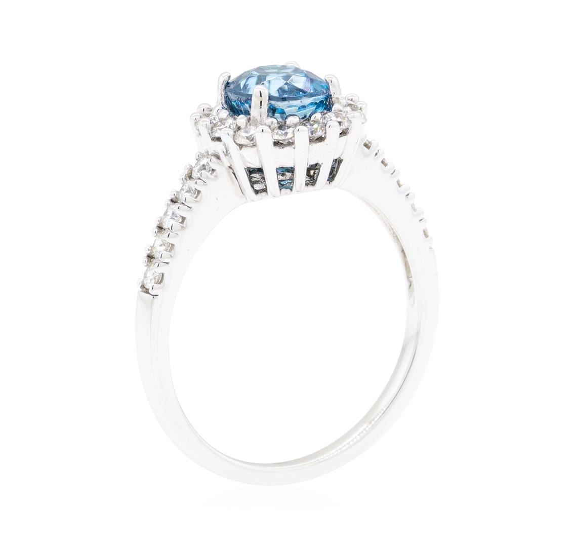 One ring featuring: 18KT white gold weighing 4.3 grams containing one blue zircon weighing 2.09ct and diamonds weighing 0.60ctw. The ring is a size 7.
