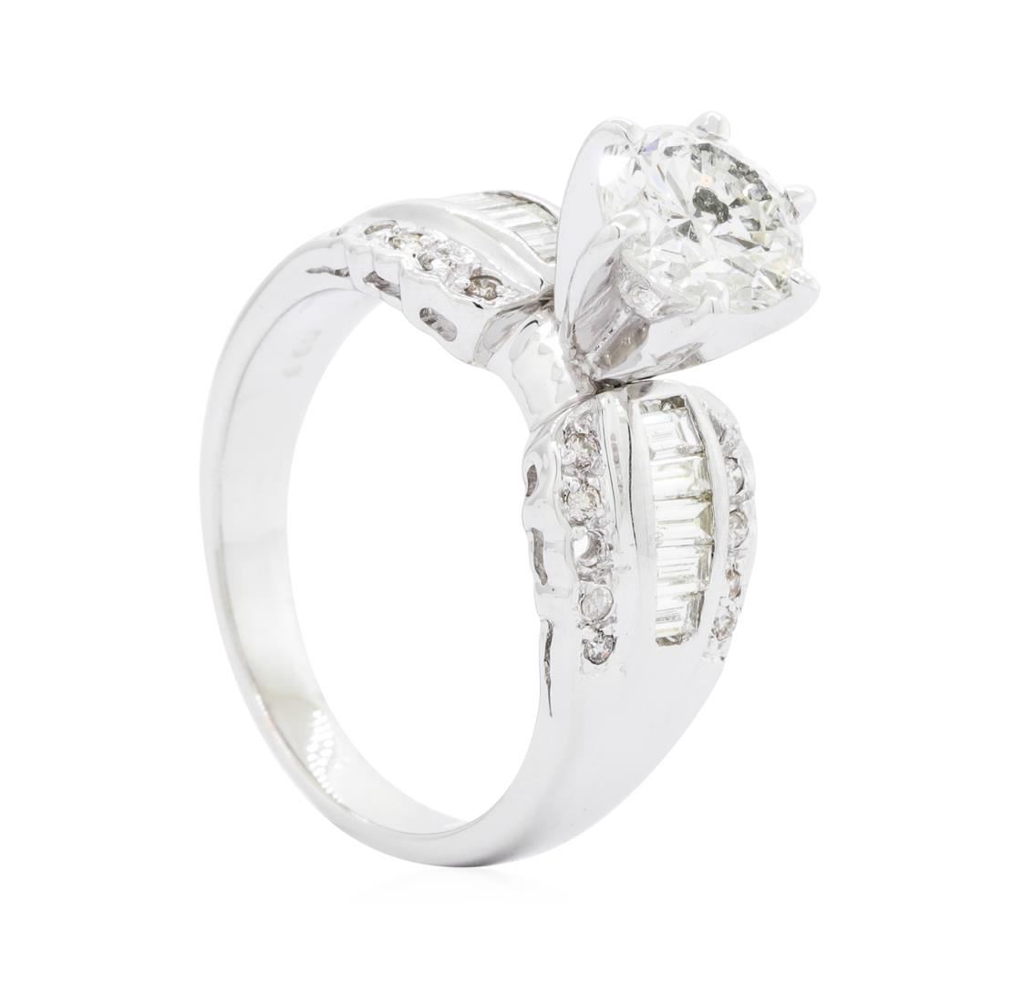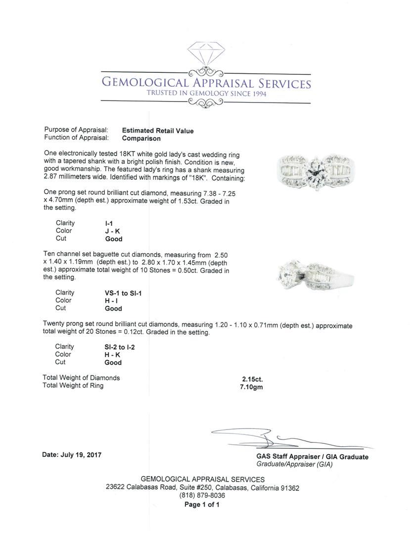 One electronically tested 18KT white gold Ladies cast wedding ring with a tapered shank with a bright polish finish. The featured Ladies ring has a shank measuring 2.87 millimeters wide. Identified with markings of '18K'. Condition is new, good workmanship. Containing: One prong set round brilliant cut diamond, measuring 7.38 - 7.25 x 4.70mm (depth est.) approximate weight of 1.53ct. Graded in the setting. Color J - K Clarity I-1 Cut Good Ten channel set baguette cut diamonds, measuring from 2.50 x 1.40 x 1.19mm (depth est.) to 2.80 x 1.70 x 1.45mm (depth est.) approximate total weight of 10 Stones = 0.50ct. Graded in the setting. Color H - I Clarity VS-1 to SI-1 Cut Good Twenty prong set round brilliant cut diamonds, measuring 1.20 - 1.10 x 0.71mm (depth est.) approximate total weight of 20 Stones = 0.12ct. Graded in the setting. Color H - K Clarity SI-2 to I-2 Cut Good. Total Weight of Diamonds 2.15ct. Total Weight of Ring 7.10gm. GAS Appraised.