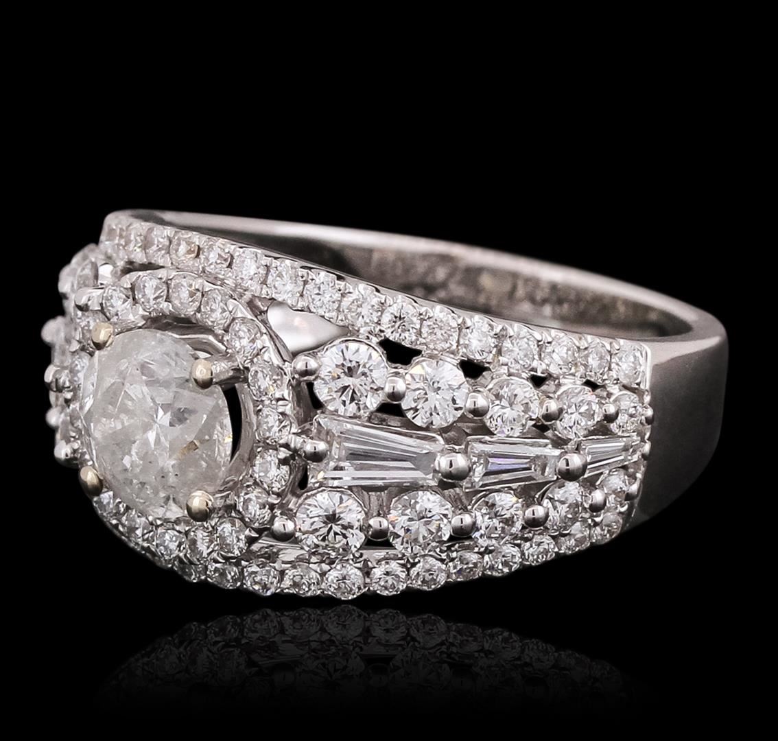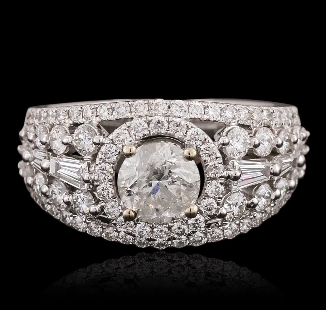 One electronically tested 18KT white gold ladies combination cast & assembled engagement ring with a bright polish finish. Identified with markings of "750". Condition is new. Containing: One prong set round brilliant cut diamond, measuring 5.94 - 5.93 x 3.92mm (depth est.) approximate weight of 0.84ct. Clarity: I-2. Color: I, Cut is Good. Eighty-Four prong set round brilliant cut diamonds, measuring 2.20 - 1.10 x 0.99mm (depth est.) approximate total weight of 84 Stones = 1.08ct. Clarity: SI-1 to I-1. Color: H - I, Cut is Good. Six prong set baguette cut diamonds, measuring from 2.00 x 1.30 x 1.11mm (depth est.) to 4.00 x 1.50 x 1.28mm (depth est.) approximate total weight of 6 Stones = 0.31ct. Clarity: VS-2. Color: I, Cut is Good. All diamonds are graded in the mounting, unless otherwise stated. Total Weight of Diamonds 2.23ct. Total Weight of Ring 5.90 grams. GGL Appraised at $12,910.00.