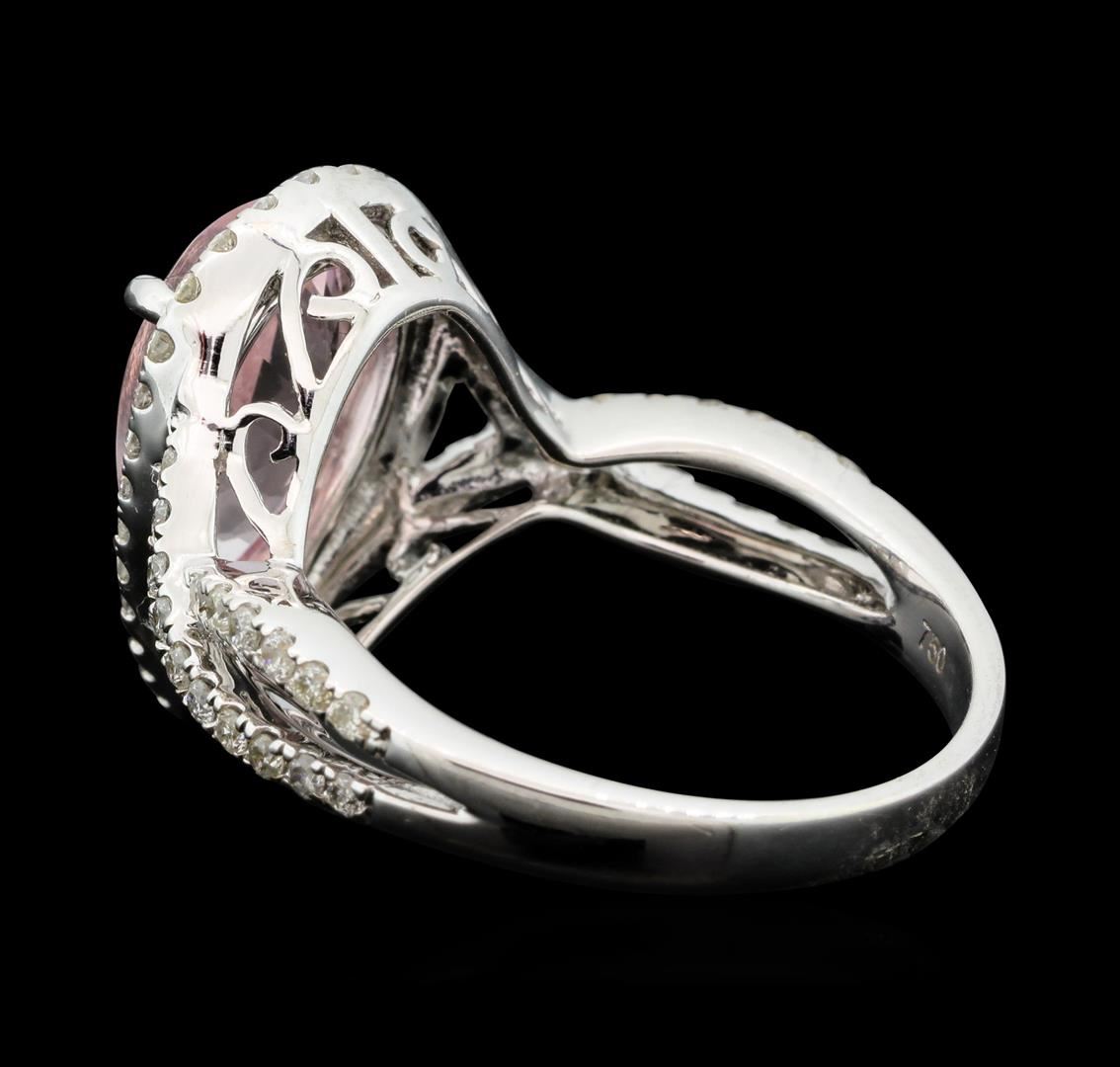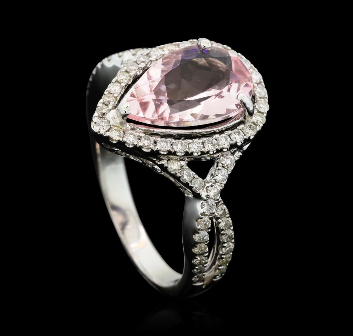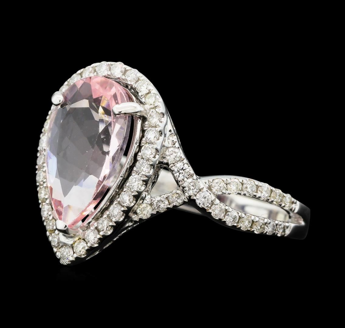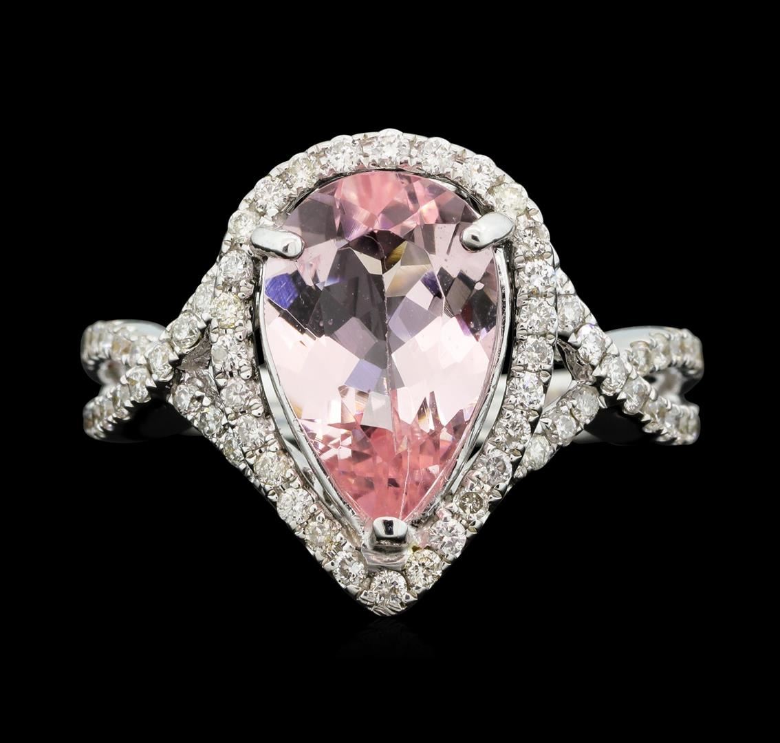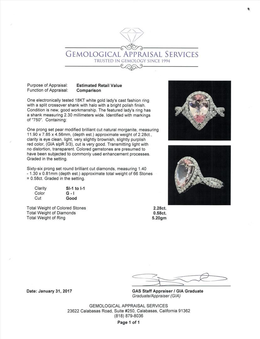 One electronically tested 18KT white gold lady's cast fashion ring with a split crossover shank with halo with a bright polish finish. The featured lady's ring has a shank measuring 2.30 millimeters wide. Identified with markings of "750". Condition is new, good workmanship. Containing: One prong set pear modified brilliant cut natural morganite, measuring 11.90 x 7.85 x 4.56mm, (depth est.) approximate weight of 2.28ct., clarity is eye clean, light, very slightly brownish, slightly purplish red color, (GIA slpR 3/3), cut is very good. Transmitting light with no distortion, transparent. Colored gemstones are presumed to have been subjected to commonly used enhancement processes. Graded in the setting.Sixty-Six prong set round brilliant cut diamonds, measuring 1.40 - 1.30 x 0.81mm (depth est.) approximate total weight of 66 Stones = 0.58ct. Graded in the setting. Clarity: SI-1 to I-1. Color: G - ICut Good. Total Weight of Colored Stones 2.28ct. Total Weight of Diamonds 0.58ct. Total Weight of Ring 5.20gm. GAS Appraised.