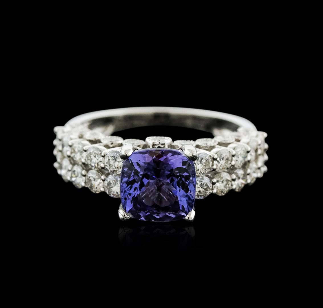 One electronically tested 18KT white gold ladies cast tanzanite and diamond ring with a bright polish finish. Identified with markings of "750". Condition is new. Containing: One prong set square modified brilliant cut natural tanzanite, measuring 7.50 x 7.50 x 4.88mm, approximate weight of 2.30ct., clarity is eye clean, type I, medium, very slightly grayish, violet color, (GIA V 5/3), cut is good. Forty-Two prong set round brilliant cut diamonds, measuring 2.50 - 1.30 x 1.14mm (depth est.) approximate total weight of 42 Stones = 1.05ct. Clarity: SI-1 to SI-2. Color: H - I, Cut is Good. Colored gemstones are presumed to have been subjected to commonly used enhancement processes. All diamonds and colored gemstones are graded in the mounting, unless otherwise stated. Total Weight of Colored Stones 2.30ct. Total Weight of Diamonds 1.05ct. Total Weight of Ring 4.50 grams. GGL Appraised at $4,535.00.