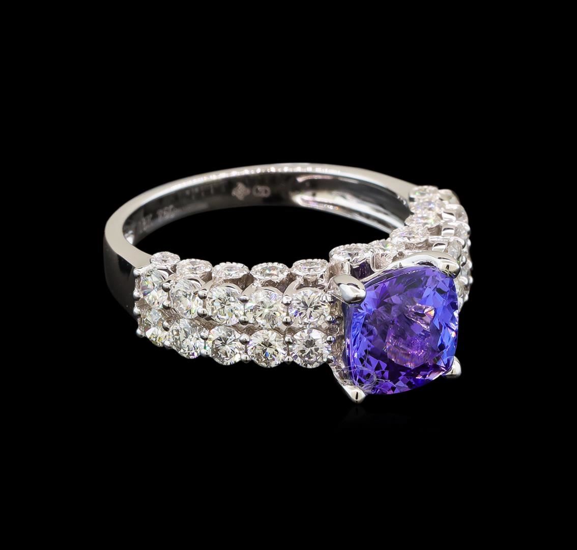 One electronically tested 18KT white gold ladies cast tanzanite and diamond ring with a bright polish finish. Identified with markings of "750". Condition is new. Containing: One prong set square modified brilliant cut natural tanzanite, measuring 7.50 x 7.50 x 4.88mm, approximate weight of 2.30ct., clarity is eye clean, type I, medium, very slightly grayish, violet color, (GIA V 5/3), cut is good. Forty-Two prong set round brilliant cut diamonds, measuring 2.50 - 1.30 x 1.14mm (depth est.) approximate total weight of 42 Stones = 1.05ct. Clarity: SI-1 to SI-2. Color: H - I, Cut is Good. Colored gemstones are presumed to have been subjected to commonly used enhancement processes. All diamonds and colored gemstones are graded in the mounting, unless otherwise stated. Total Weight of Colored Stones 2.30ct. Total Weight of Diamonds 1.05ct. Total Weight of Ring 4.50 grams. GGL Appraised at $4,535.00.