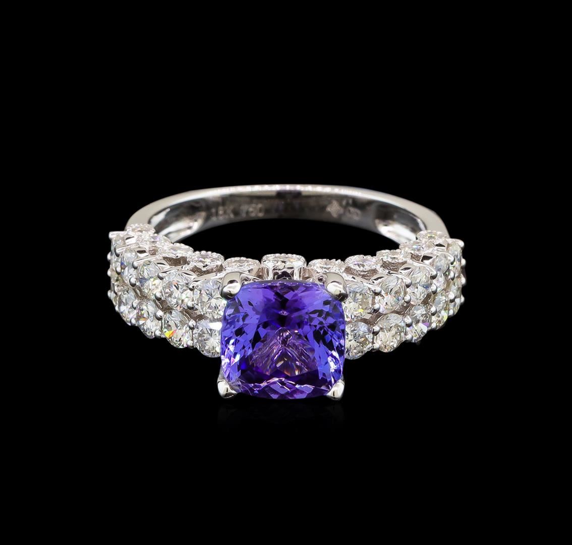 One electronically tested 18KT white gold ladies cast tanzanite and diamond ring with a bright polish finish. Identified with markings of "750". Condition is new. Containing: One prong set square modified brilliant cut natural tanzanite, measuring 7.50 x 7.50 x 4.88mm, approximate weight of 2.30ct., clarity is eye clean, type I, medium, very slightly grayish, violet color, (GIA V 5/3), cut is good. Forty-Two prong set round brilliant cut diamonds, measuring 2.50 - 1.30 x 1.14mm (depth est.) approximate total weight of 42 Stones = 1.05ct. Clarity: SI-1 to SI-2. Color: H - I, Cut is Good. Colored gemstones are presumed to have been subjected to commonly used enhancement processes. All diamonds and colored gemstones are graded in the mounting, unless otherwise stated. Total Weight of Colored Stones 2.30ct. Total Weight of Diamonds 1.05ct. Total Weight of Ring 4.50 grams. GGL Appraised at $4,535.00.