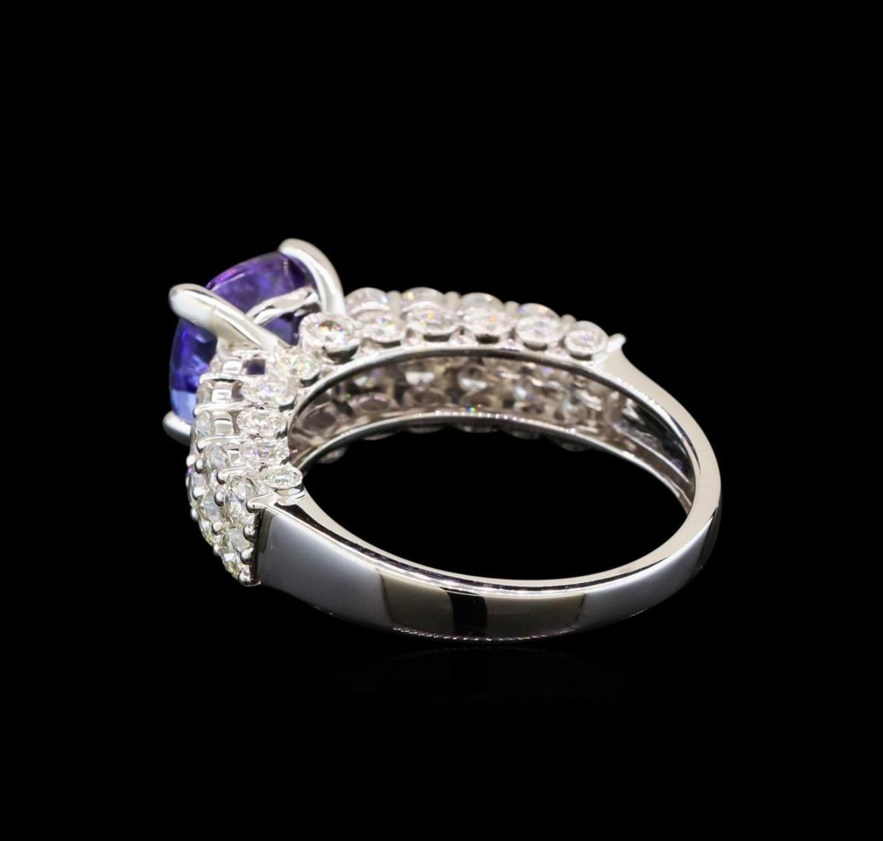 One electronically tested 18KT white gold ladies cast tanzanite and diamond ring with a bright polish finish. Identified with markings of "750". Condition is new. Containing: One prong set square modified brilliant cut natural tanzanite, measuring 7.50 x 7.50 x 4.88mm, approximate weight of 2.30 ct., clarity is eye clean, type I, medium, very slightly grayish, violet color, (GIA V 5/3), cut is good. Forty-Two prong set round brilliant cut diamonds, measuring 2.50 - 1.30 x 1.14mm (depth est.) approximate total weight of 42 Stones = 1.05ct. Clarity: SI-1 to SI-2. Color: H - I, Cut is Good. Colored gemstones are presumed to have been subjected to commonly used enhancement processes. All diamonds and colored gemstones are graded in the mounting, unless otherwise stated. Total Weight of Colored Stones 2.30 ct. Total Weight of Diamonds 1.05ct. Total Weight of Ring 4.50 grams. GGL Appraised.