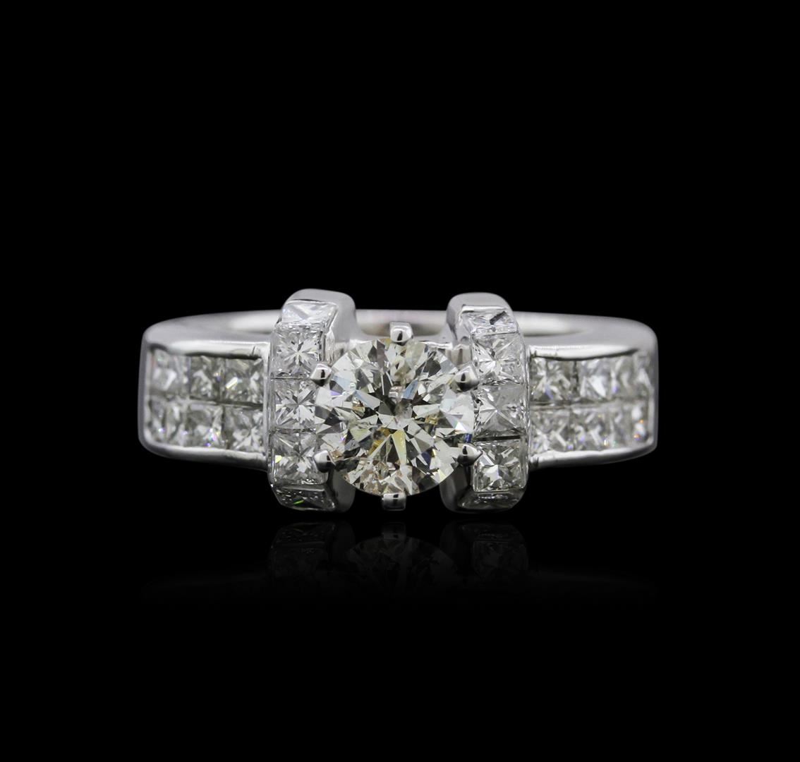 One electronically tested 18KT white gold ladies cast diamond engagement ring with a bright polish finish. Identified with markings of "18K". Condition is new. Containing: One prong set round brilliant cut diamond, measuring 6.50 - 6.50 x 4.07mm (depth est.) approximate weight of 1.05ct. Clarity: I-1. Color: K, Cut is Good. Twenty-Six channel set princess cut diamonds, measuring 2.00 x 2.00 x 1.50mm (depth est.) approximate total weight of 26 Stones = 1.28ct. Clarity: VS-2 to SI-1. Color: H - I, Cut is Good. All diamonds are graded in the mounting, unless otherwise stated. Total Weight of Diamonds 2.33ct. Total Weight of Engagement Ring 10.10 grams. GGL Appraised at $11,955.00.
