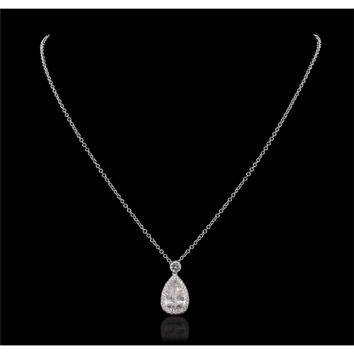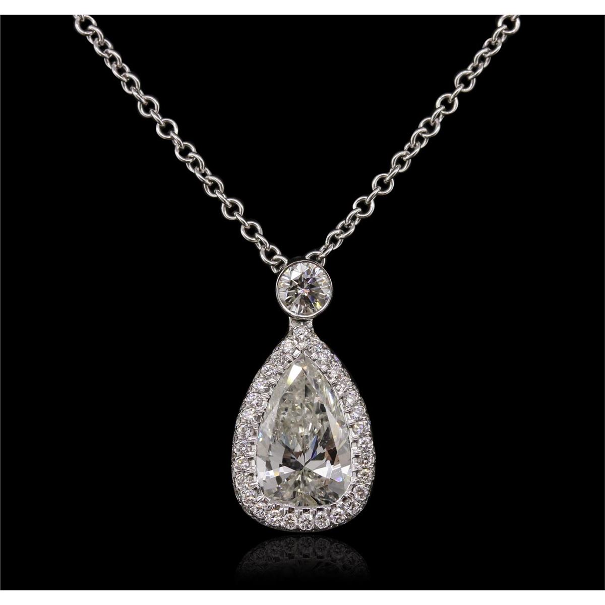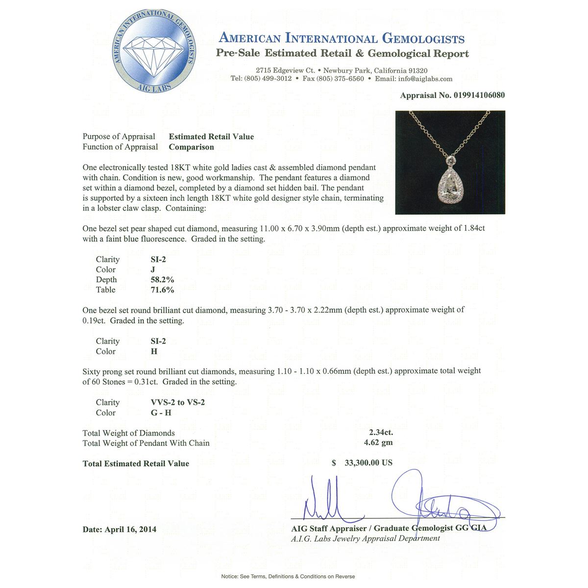One electronically tested 18KT white gold ladies cast & assembled diamond pendant with chain. Condition is new, good workmanship. The pendant features a diamond set within a diamond bezel, completed by a diamond set hidden bail. The pendant is supported by a sixteen inch length 18KT white gold designer style chain, terminating in a lobster claw clasp. Containing: One bezel set pear shaped cut diamond, measuring 11.00 x 6.70 x 3.90mm (depth est.) approximate weight of 1.84ct with a faint blue fluorescence. Graded in the setting. Clarity: SI-2. Color: J Depth 58.2%. Table 71.6%. One bezel set round brilliant cut diamond, measuring 3.70 - 3.70 x 2.22mm (depth est.) approximate weight of 0.19ct. Graded in the setting. Clarity: SI-2. Color: H Sixty prong set round brilliant cut diamonds, measuring 1.10 - 1.10 x 0.66mm (depth est.) approximate. Total Weight of 60 Stones = 0.31ct. Graded in the setting. Clarity: VVS-2 to VS-2. Color: G - H. Total Weight of Diamonds 2.34ct. Total Weight of Pendant With Chain 4.62 grams. AIG Appraised at $33,300.00.