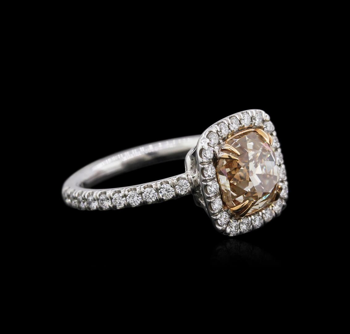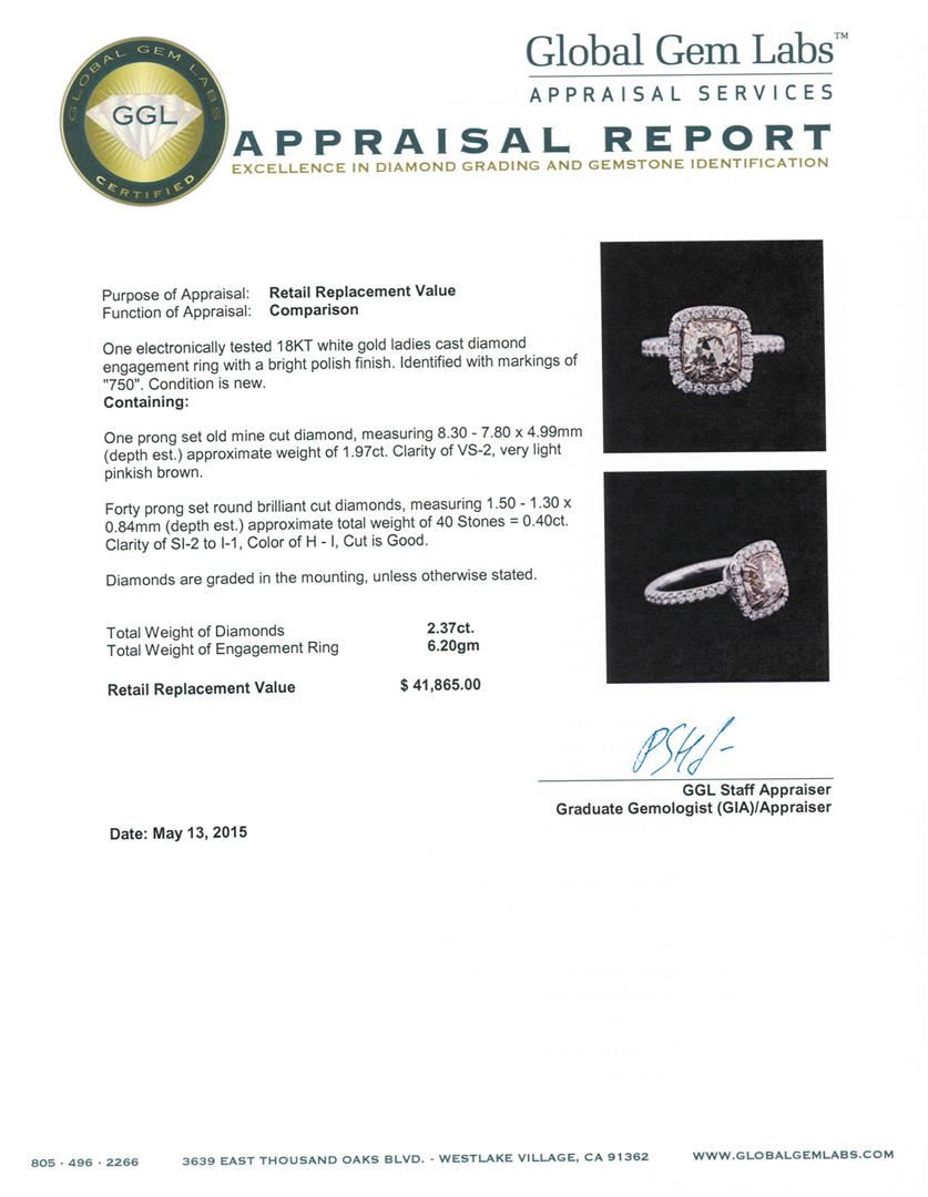 One electronically tested 18KT white gold ladies cast diamond engagement ring with a bright polish finish. Identified with markings of "750". Condition is new. Containing: One prong set old mine cut diamond, measuring 8.30 - 7.80 x 4.99mm (depth est.) approximate weight of 1.97ct. Clarity: VS-2, very light pinkish brown. Forty prong set round brilliant cut diamonds, measuring 1.50 - 1.30 x 0.84mm (depth est.) approximate total weight of 40 Stones = 0.40ct. Clarity: SI-2 to I-1. Color: H - I, Cut is Good. Diamonds are graded in the mounting, unless otherwise stated. Total Weight of Diamonds 2.37ct. Total Weight of Engagement Ring 6.20 grams. GGL Appraised at $41,865.00.
