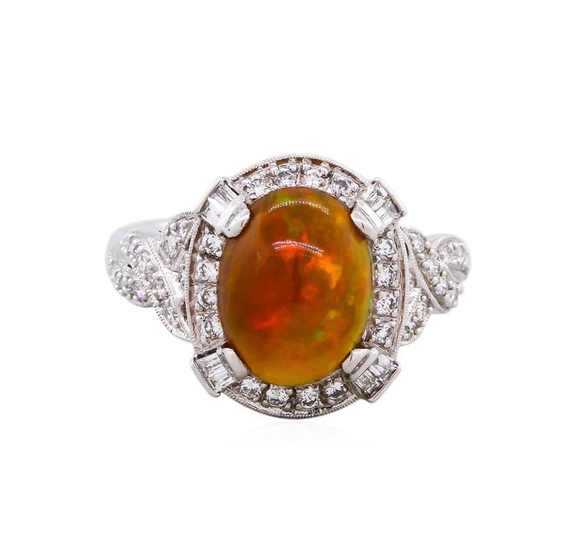 One elegant opal and diamond ring set in 18KT white gold weighing 4.85 grams containing a 2.41 carat opal center stone beautifully showcased by fourty-six round diamonds which extend down both sides of the band and weigh in collectively at 0.46 carats.