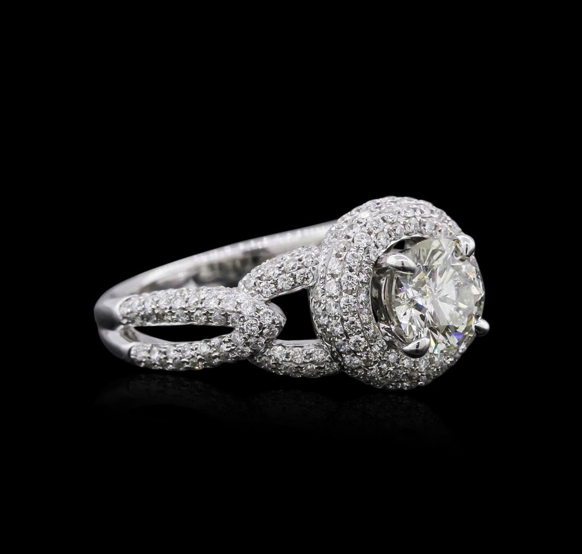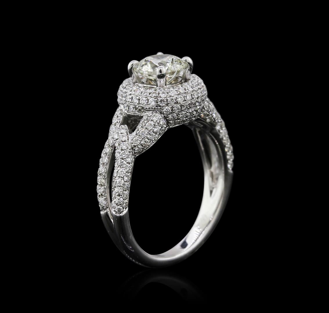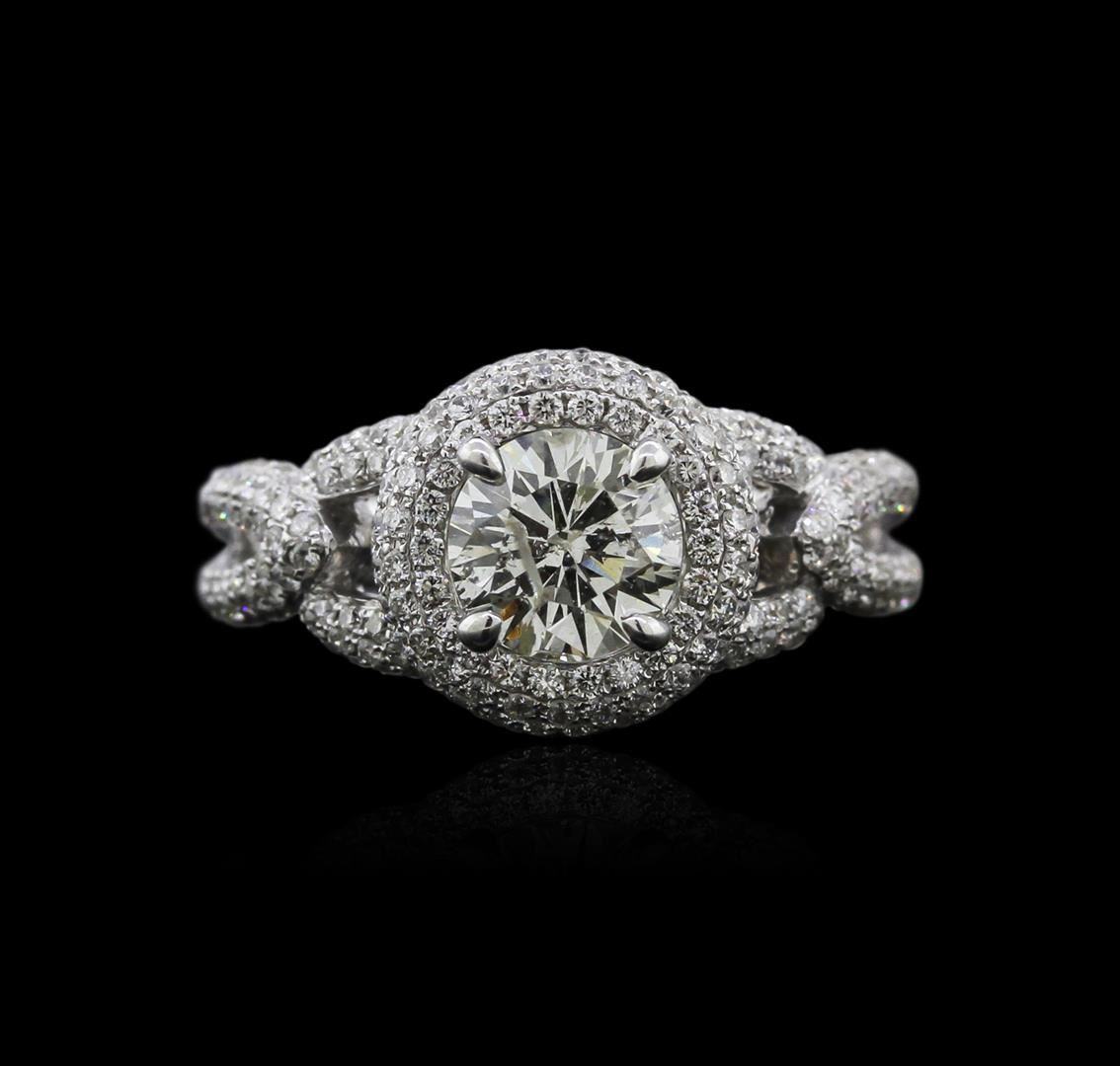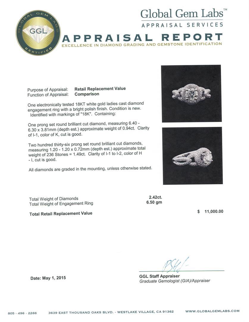 One electronically tested 18KT white gold ladies cast diamond engagement ring with a bright polish finish. Identified with markings of "18K". Condition is new. Containing: One prong set round brilliant cut diamond, measuring 6.40 - 6.30 x 3.81mm (depth est.) approximate weight of 0.94ct. Clarity: I-1. Color: K, Cut is Good. Two Hundred Thirty-Six prong set round brilliant cut diamonds, measuring 1.20 - 1.20 x 0.72mm (depth est.) approximate total weight of 236 Stones = 1.49ct. Clarity: I-1 to I-2. Color: H - I, Cut is Good. All diamonds are graded in the mounting, unless otherwise stated. Total Weight of Diamonds 2.42ct. Total Weight of Engagement Ring 6.50 grams. GGL Appraised at $11,000.00.