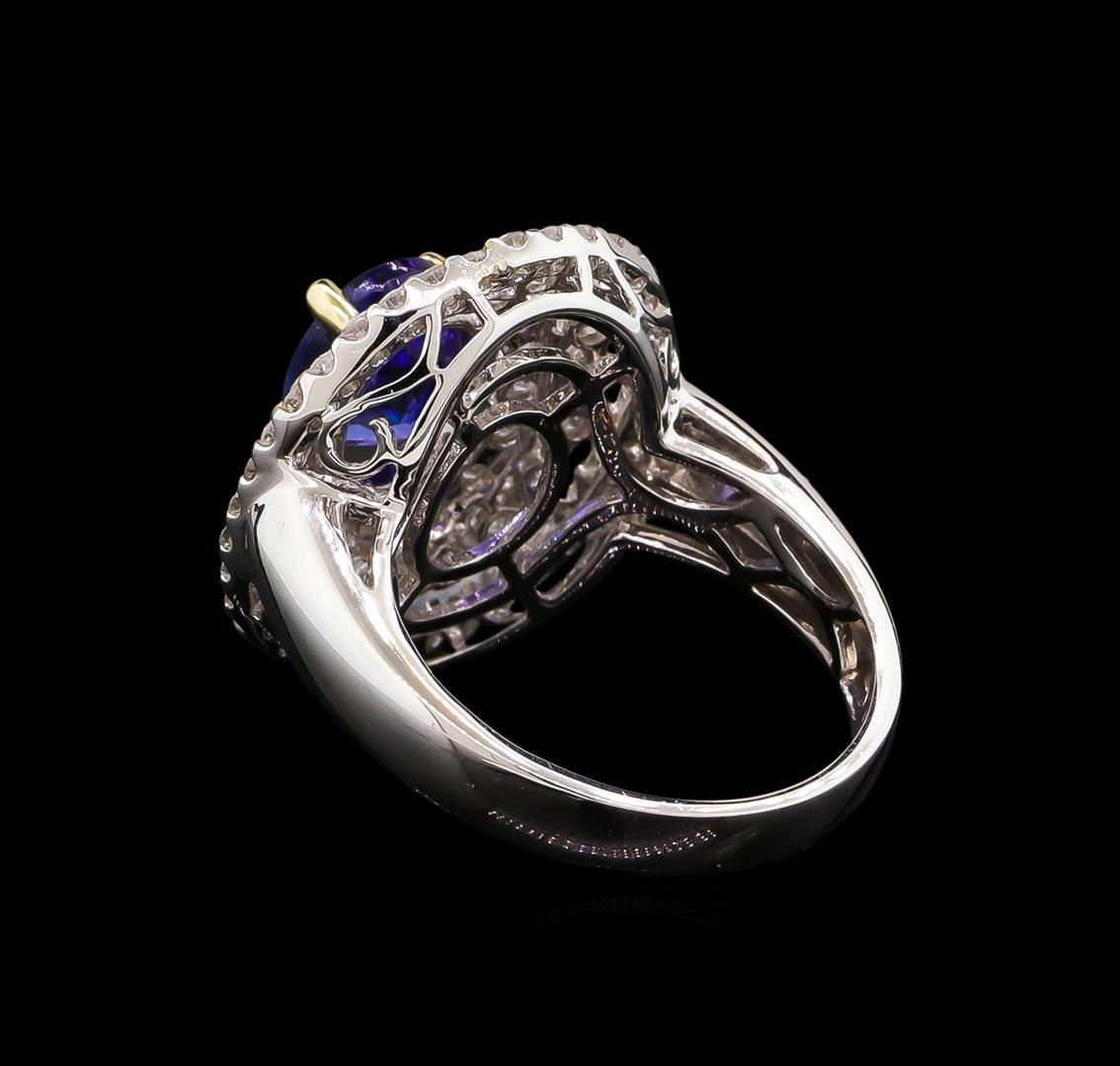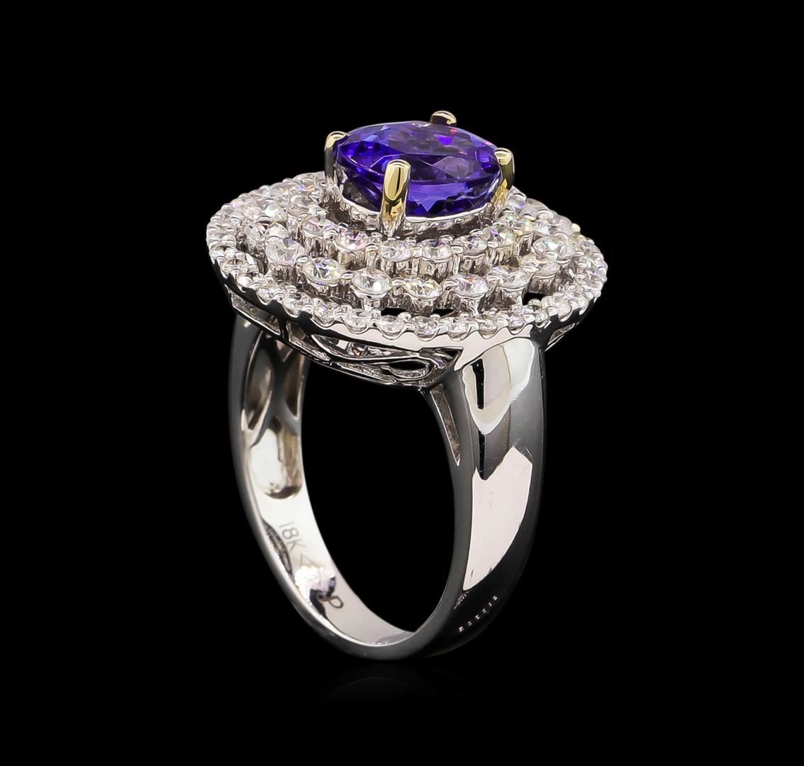 One electronically tested 18KT white gold Ladies combination cast & assembled ring with a bright polish finish. Condition is new. Identified with markings of "18K". Containing: One prong set oval modified brilliant cut natural tanzanite, measuring 8.70 x 7.80 x 5.30mm, approximate weight of 2.42ct., clarity is eye clean, type I, medium, moderately strong, violet color, (GIA V 5/4), cut is good. Colored gemstones are presumed to have been subjected to commonly used color/clarity enhancement processes. Seventy-One prong set round brilliant cut diamonds, measuring 1.90 - 1.30 x 0.96mm (depth est.) approximate. Total Weight of 71 Stones = 1.06ct. Clarity: I-1 to I-2. Color: H - I, Cut is Good. Total Weight of Colored Stones 2.42ct. Total Weight of Diamonds 1.06ct. Total Weight of Ring 6.80 grams. GGL Appraised at $8,515.00.