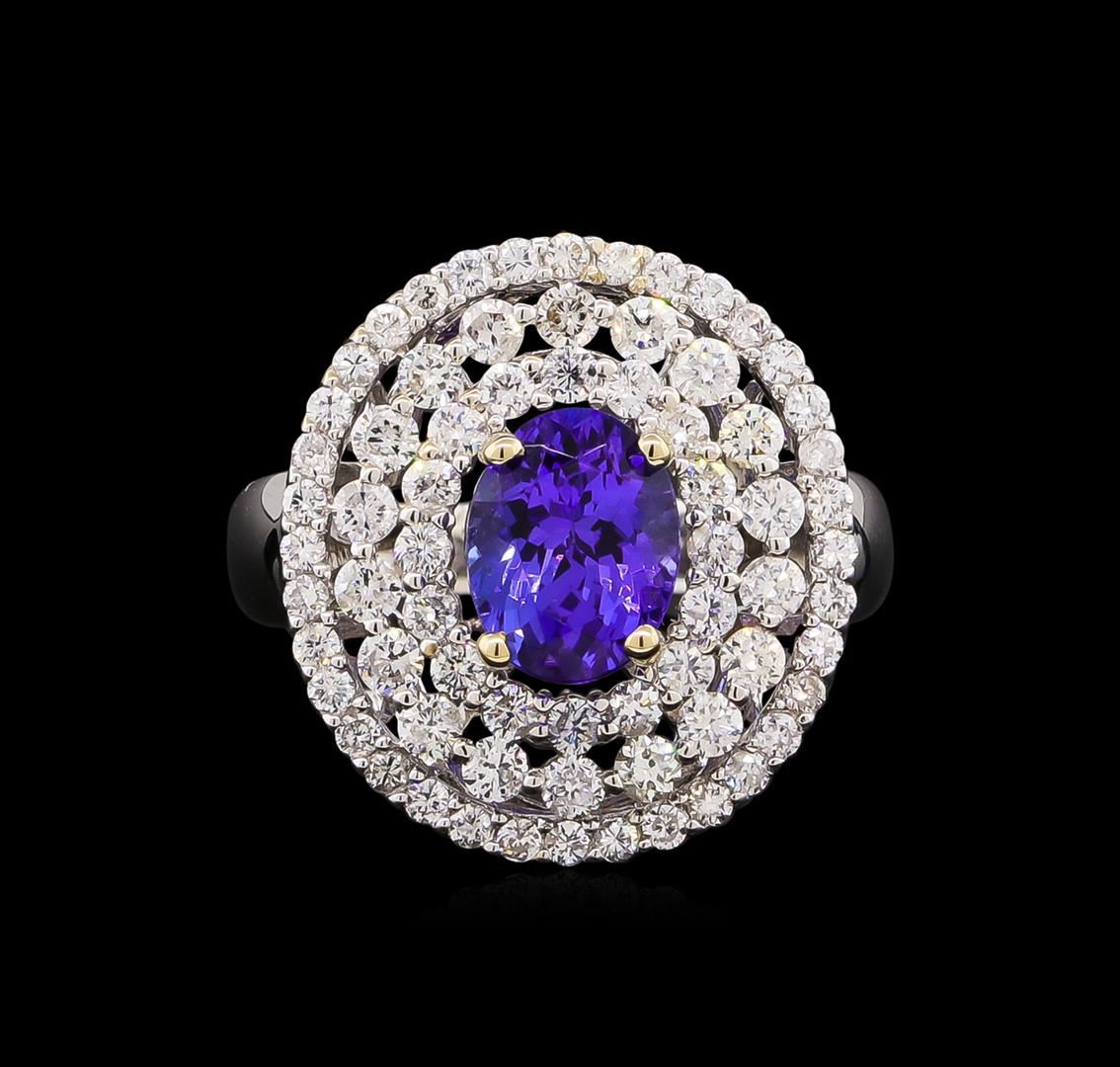 One electronically tested 18KT white gold Ladies combination cast & assembled ring with a bright polish finish. Condition is new. Identified with markings of "18K". Containing: One prong set oval modified brilliant cut natural tanzanite, measuring 8.70 x 7.80 x 5.30mm, approximate weight of 2.42ct., clarity is eye clean, type I, medium, moderately strong, violet color, (GIA V 5/4), cut is good. Colored gemstones are presumed to have been subjected to commonly used color/clarity enhancement processes. Seventy-One prong set round brilliant cut diamonds, measuring 1.90 - 1.30 x 0.96mm (depth est.) approximate. Total Weight of 71 Stones = 1.06ct. Clarity: I-1 to I-2. Color: H - I, Cut is Good. Total Weight of Colored Stones 2.42ct. Total Weight of Diamonds 1.06ct. Total Weight of Ring 6.80 grams. GGL Appraised at $8,515.00.