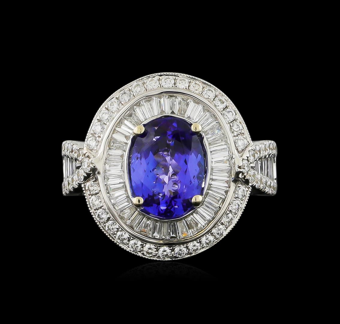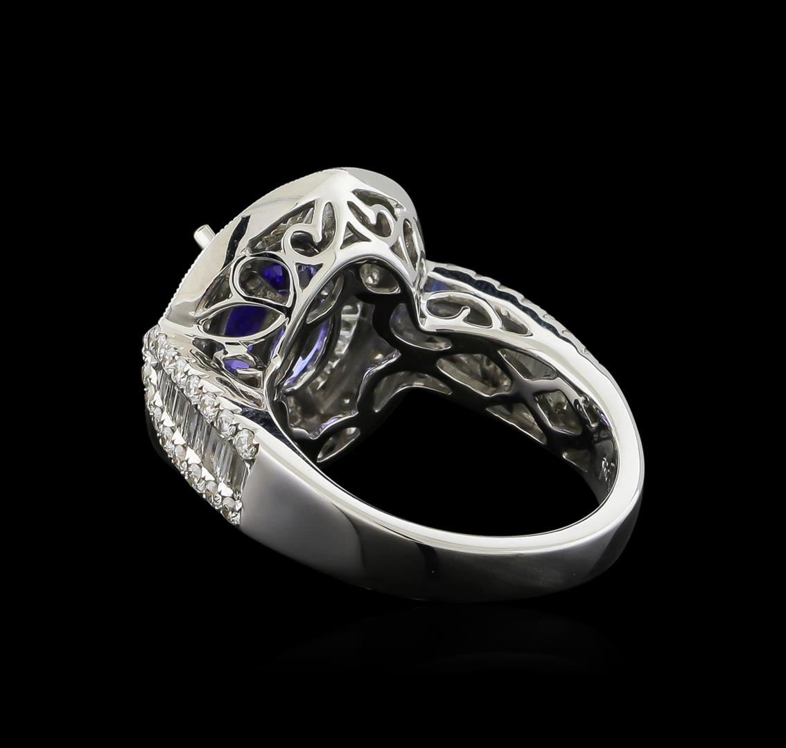 One electronically tested 18KT white gold ladies combination cast & assembled engagement ring with a bright polish finish. Identified with markings of "18K". Condition is new. Containing: One prong set oval modified brilliant cut natural tanzanite, measuring 10.00 x 7.42 x 4.82mm, approximate weight of 2.45ct., clarity is eye clean, type I, medium, moderately strong, bluish violet color, (GIA bV 5/4), cut is good. Sixty-Four prong set round brilliant cut diamonds, measuring 1.50 - 1.50 x 0.90mm (depth est.) approximate total weight of 64 Stones = 0.79ct. Clarity: SI-1 to SI-2. Color: I - J, Cut is Good. Fifty-Nine channel set baguette cut diamonds, measuring from 1.20 x 1.20 x 1.02mm (depth est.) to 1.80 x 1.50 x 1.28mm (depth est.) approximate total weight of 59 Stones = 1.26ct. Clarity: SI-1. Color: H - I, Cut is Good. Colored gemstones are presumed to have been subjected to commonly used enhancement processes. All diamonds and colored gemstones are graded in the mounting, unless otherwise stated. Total Weight of Colored Stones 2.45ct. Total Weight of Diamonds 2.04ct. Total Weight of Ring 9.80 grams. GGL Appraised at $12,730.00.