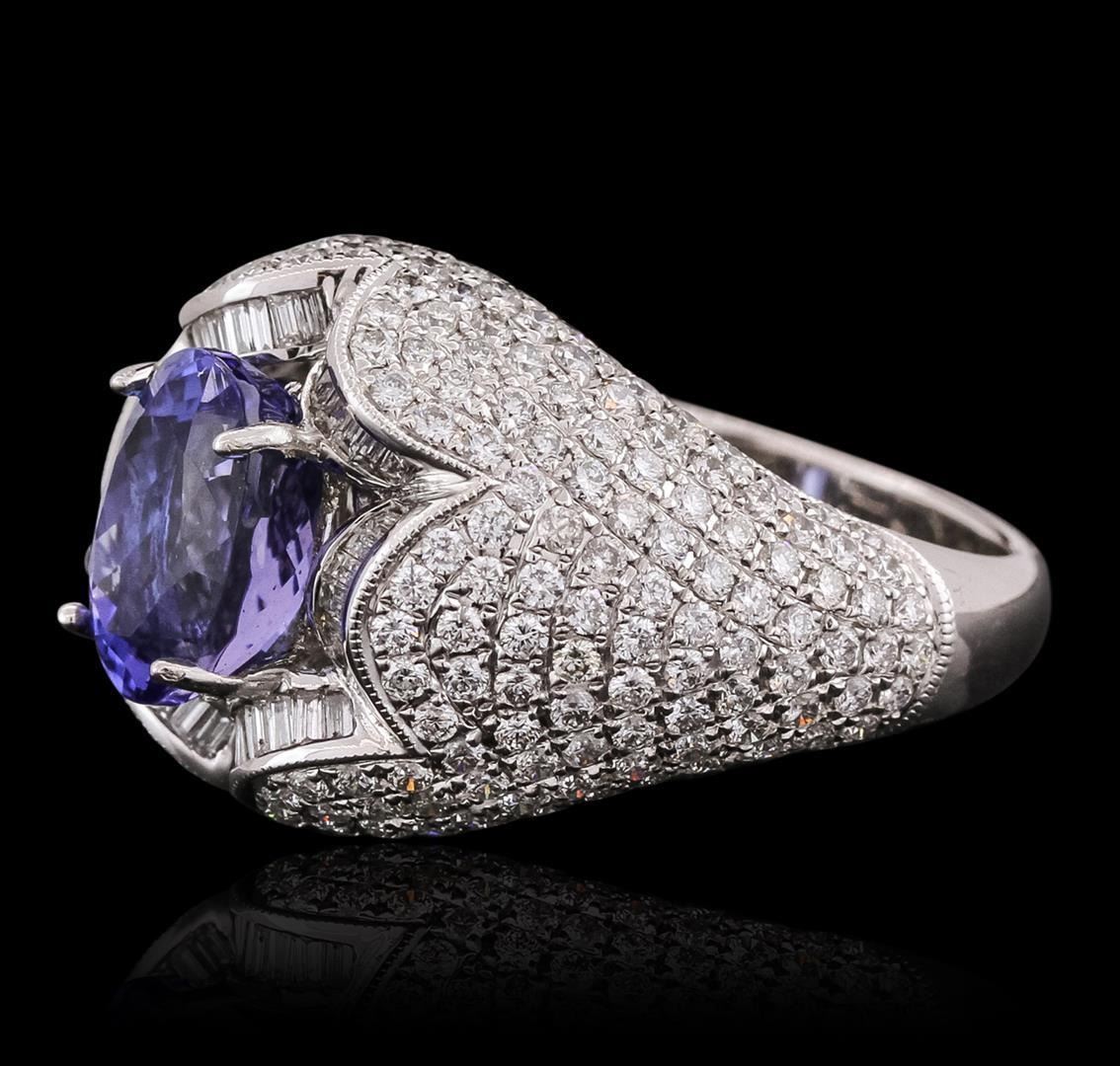 One electronically tested 18KT white gold ladies combination cast & assembled prong set ring with a bright polish finish. Identified with markings of "750". Condition is new. Containing: One prong set oval modified brilliant cut natural tanzanite, measuring 10.51 x 7.35 x 4.70mm, approximate weight of 2.51ct., clarity is eye clean, type I, medium, moderately strong, bluish violet color, (GIA bV 5/4), cut is good. Two Hundred Sixty-Three prong set round brilliant cut diamonds, measuring 1.50 - 1.50 x 0.90mm (depth est.) approximate total weight of 263 Stones = 2.67ct. Clarity: SI-1 to I-1. Color: I - J, Cut is Good. Forty-Two channel set baguette cut diamonds, measuring 1.50 x 1.00 x 0.85mm (depth est.) approximate total weight of 42 Stones = 0.38ct. Clarity: SI-2. Color: H, Cut is Good. Colored gemstones are presumed to have been subjected to commonly used enhancement processes. All diamonds and colored gemstones are graded in the mounting, unless otherwise stated. Total Weight of Colored Stones 2.51ct. Total Weight of Diamonds 3.05ct. Total Weight of Ring 11.50 grams. GGL Appraised.