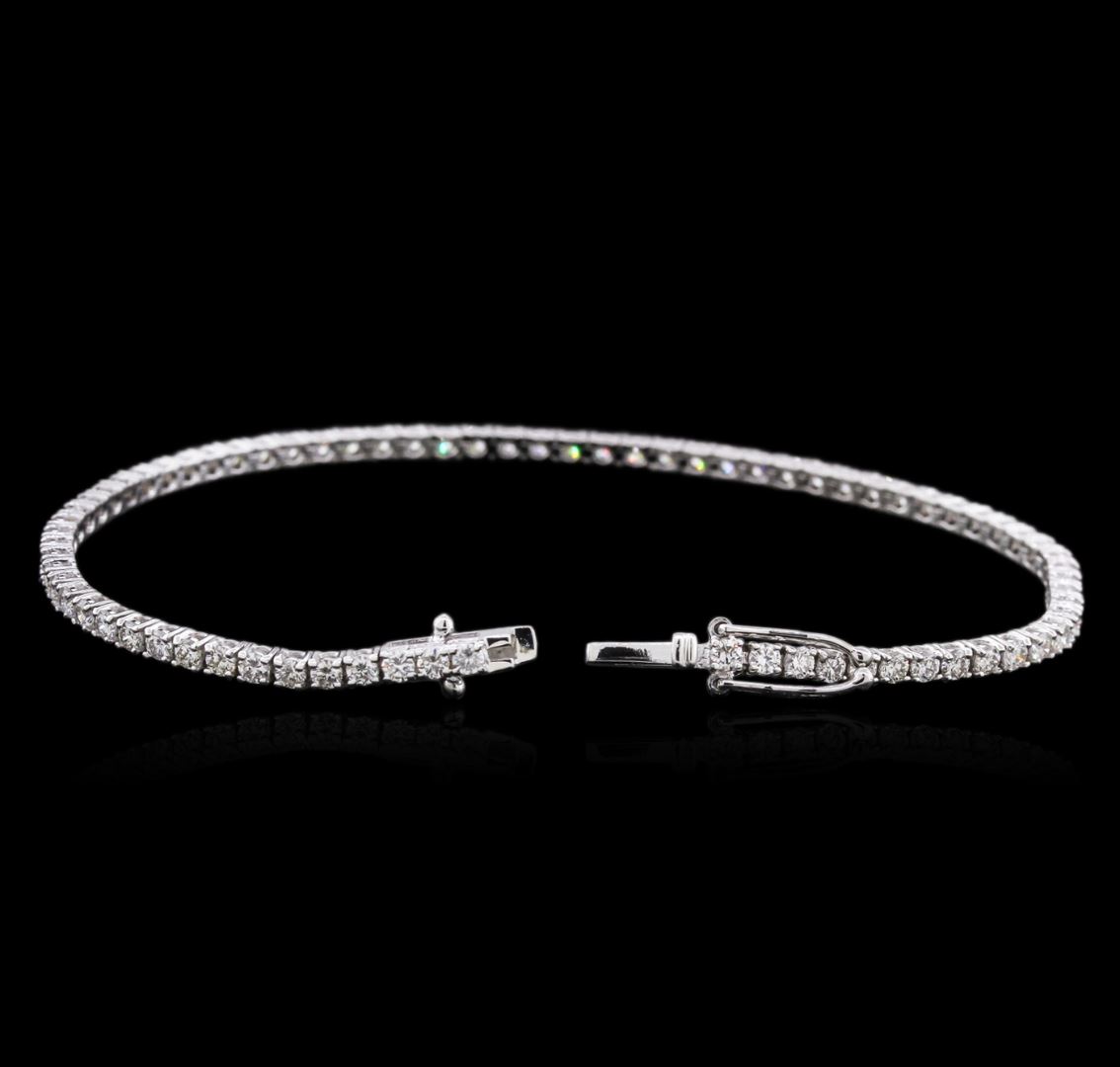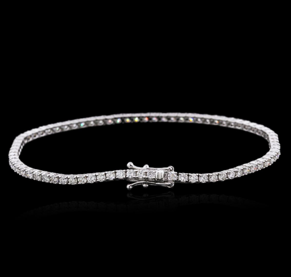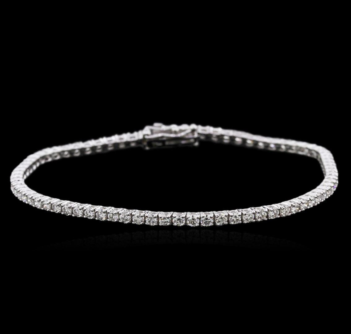 One electronically tested 18KT white gold ladies combination cast & assembled diamond tennis bracelet with a hidden box clasp with safety closer with a bright polish finish. Bracelet measures 7-1/8" long. Identified with markings of "750". Condition is new. Containing: Seventy-Five prong set round brilliant cut diamonds, measuring 2.10 - 2.00 x 1.31mm (depth est.) approximate total weight of 75 Stones = 2.51ct. Clarity: SI-1 to SI-2. Color: I - J, Cut is Good. Diamonds are graded in the mounting, unless otherwise stated. Total Weight of Diamonds 2.51ct. Total Weight of Tennis Bracelet 7.00 grams. GGL Appraised at $5,050.00.