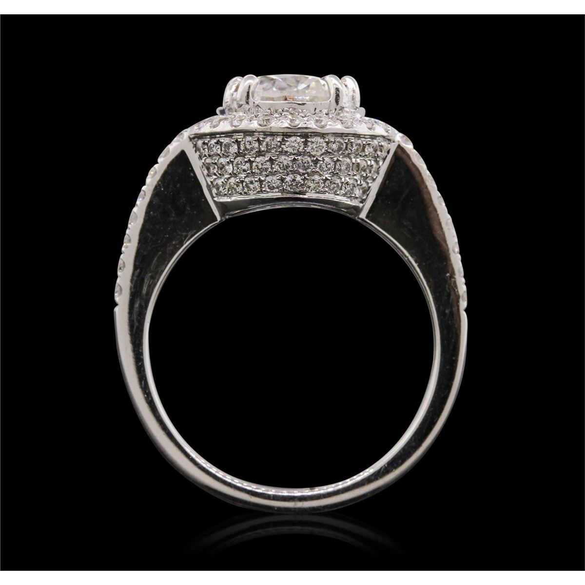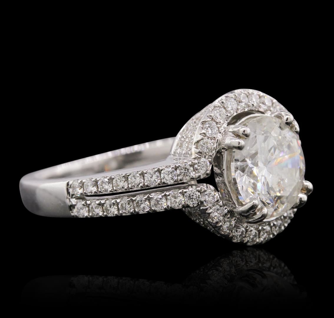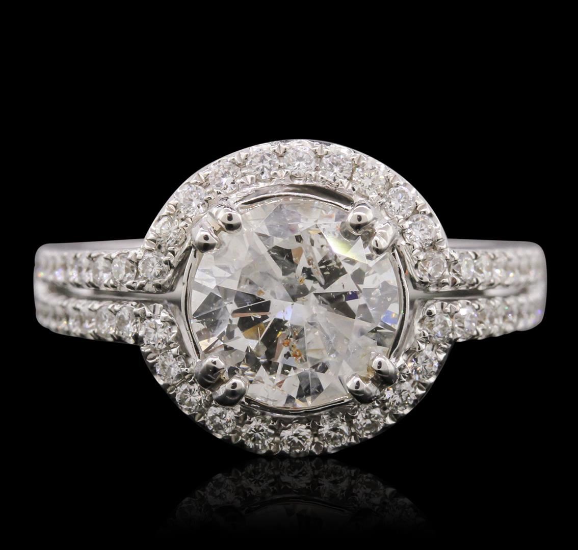 One electronically tested 18KT white gold Ladies combination cast & assembled engagement ring with a bright polish finish. Condition is new. Identified with markings of "18K". Containing: One prong set round brilliant cut diamond, measuring 8.50 - 8.20 x 4.80mm (depth est.) approximate weight of 2.04ct. Clarity: I-2. Color: I, Cut is Good. Sixty prong set round brilliant cut diamonds, measuring 1.30 - 1.30 x 0.78mm (depth est.) approximate. Total Weight of 60 Stones = 0.48ct. Clarity: I-1 to I-2. Color: I - J, Cut is Good. Total Weight of Diamonds 2.52ct. Total Weight of Engagement Ring 8.00 grams. GGL Appraised at $25,520.00.