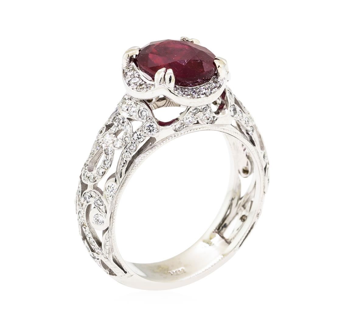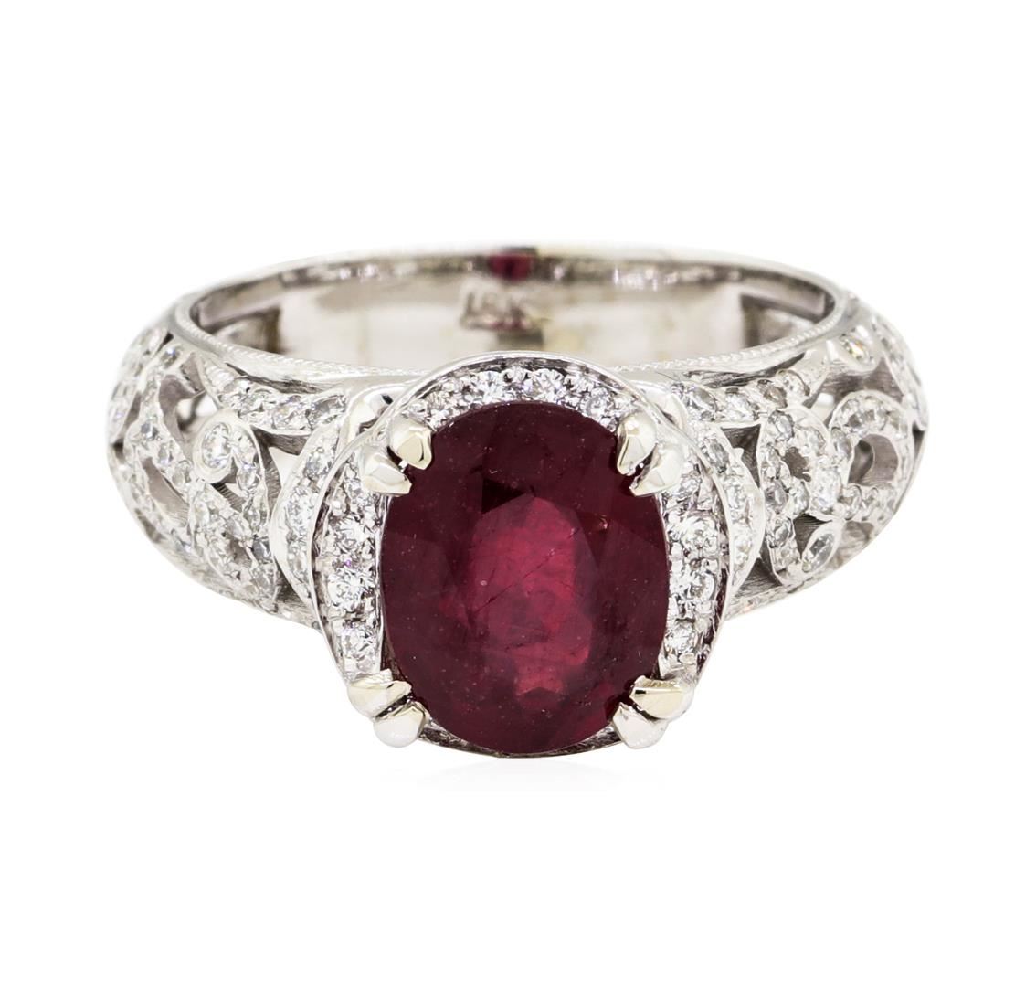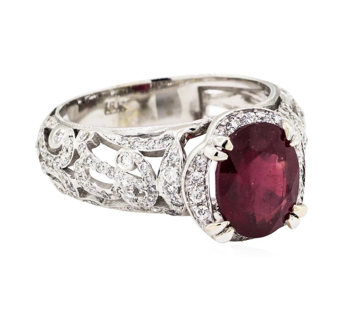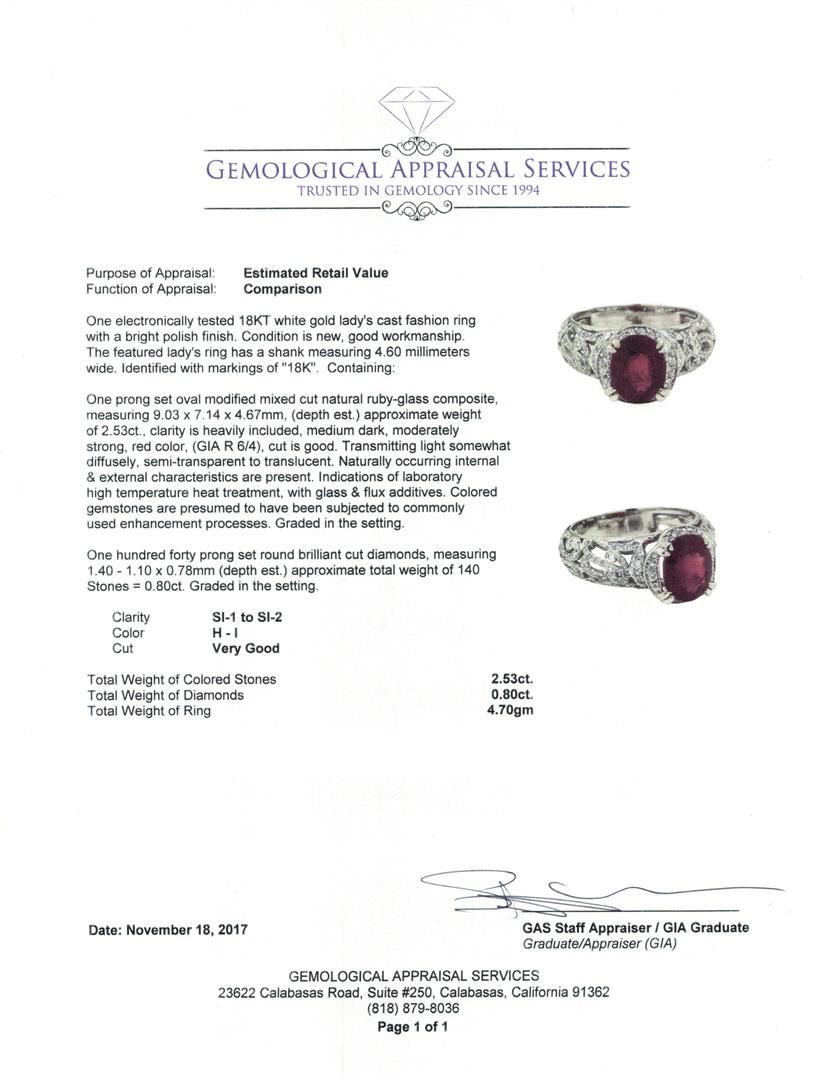 One electronically tested 18KT white gold lady's cast fashion ring with a bright polish finish. The featured lady's ring has a shank measuring 4.60 millimeters wide. Identified with markings of '18K'. Condition is new, good workmanship. Containing: One prong set oval modified mixed cut natural ruby-glass composite, measuring 9.03 x 7.14 x 4.67mm, (depth est.) approximate weight of 2.53ct., clarity is heavily included, medium dark, moderately strong, red color, (GIA R 6/4), cut is good. Transmitting light somewhat diffusely, semi-transparent to translucent. Naturally occurring internal & external characteristics are present. Indications of laboratory high temperature heat treatment, with glass & flux additives. Colored gemstones are presumed to have been subjected to commonly used enhancement processes. Graded in the setting. One Hundred Forty prong set round brilliant cut diamonds, measuring 1.40 - 1.10 x 0.78mm (depth est.) approximate total weight of 140 Stones = 0.80ct. Graded in the setting. Color H - I Clarity SI-1 to SI-2 Cut Very Good. Total Weight of Colored Stones 2.53ct.. Total Weight of Diamonds 0.80ct.. Total Weight of Ring 4.70gm. GAS Appraised.