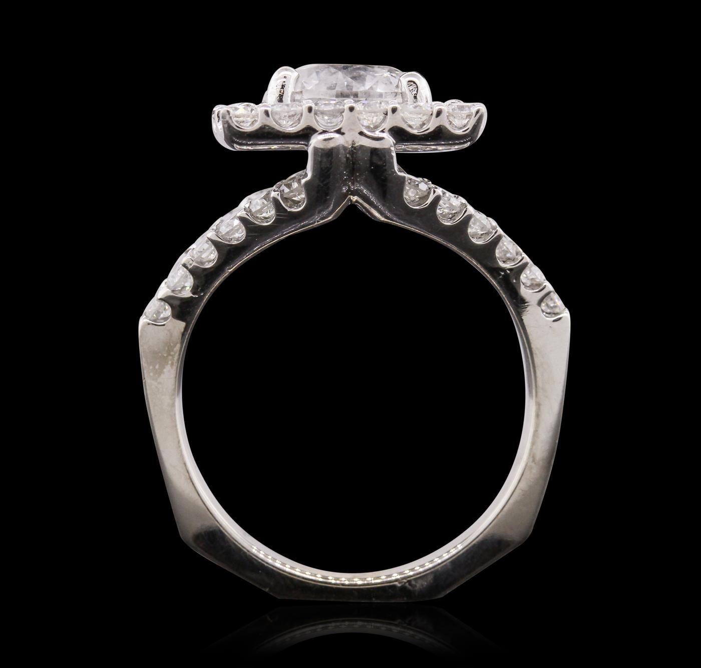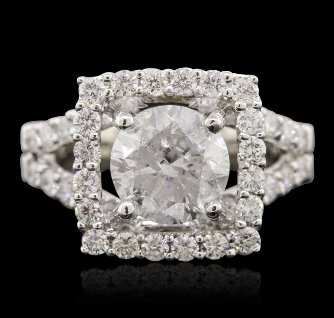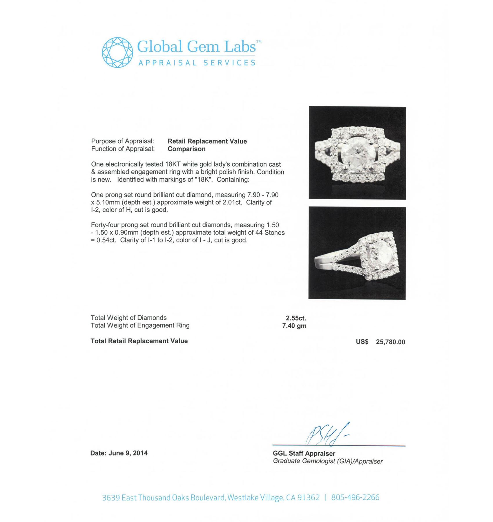 One electronically tested 18KT white gold Ladies combination cast & assembled engagement ring with a bright polish finish. Condition is new. Identified with markings of "18K". Containing: One prong set round brilliant cut diamond, measuring 7.90 - 7.90 x 5.10mm (depth est.) approximate weight of 2.01ct. Clarity: I-2. Color: H, Cut is Good. Forty-Four prong set round brilliant cut diamonds, measuring 1.50 - 1.50 x 0.90mm (depth est.) approximate. Total Weight of 44 Stones = 0.54ct. Clarity: I-1 to I-2. Color: I - J, Cut is Good. Total Weight of Diamonds 2.55ct. Total Weight of Engagement Ring 7.40 grams. GGL Appraised at $25,780.00.