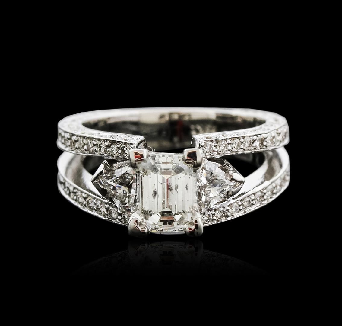 One electronically tested 18KT white gold ladies cast diamond engagement ring with a tapered shank with a bright polish finish. Identified with markings of "18K". Condition is new. Containing: One prong set emerald cut diamond, measuring 6.80 x 4.57 x 3.38mm (depth est.) approximate weight of 0.97ct. Clarity: I-1. Color: J, Cut is Good. Two prong set sheild cut diamonds, measuring 4.50 x 4.50 x 0.00mm (depth est.) approximate total weight of 2 Stones = 0.80ct. Clarity: VS-2. Color: I - J, Cut is Good. One Hundred Twenty prong set round brilliant cut diamonds, measuring 1.30 - 1.30 x 0.78mm (depth est.) approximate total weight of 120 Stones = 0.96ct. Clarity: SI-2 to I-1. Color: H - I, Cut is Good. All diamonds are graded in the mounting, unless otherwise stated. Total Weight of Diamonds 2.73ct. Total Weight of Engagement Ring 8.20 grams. GGL Appraised at $8,140.00.