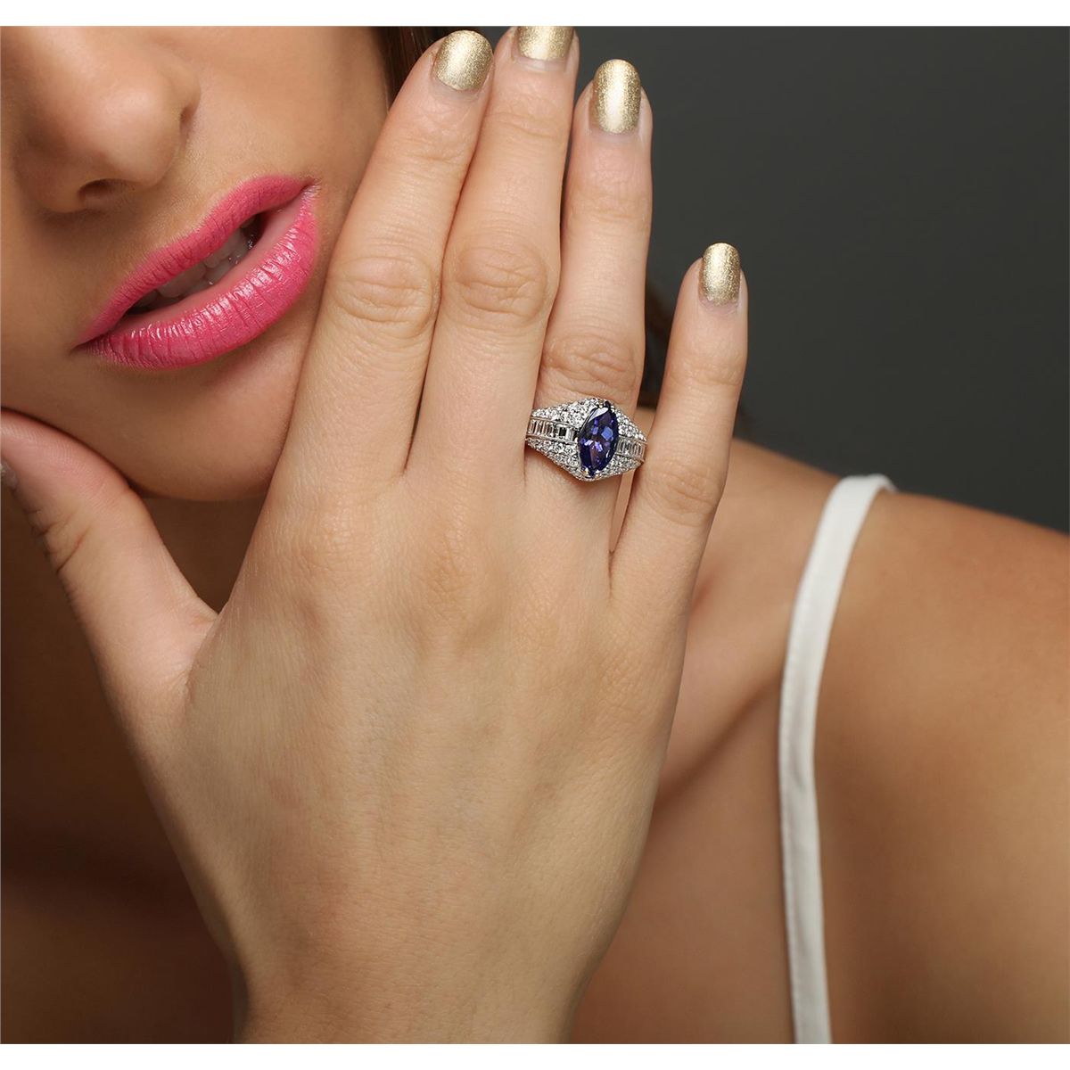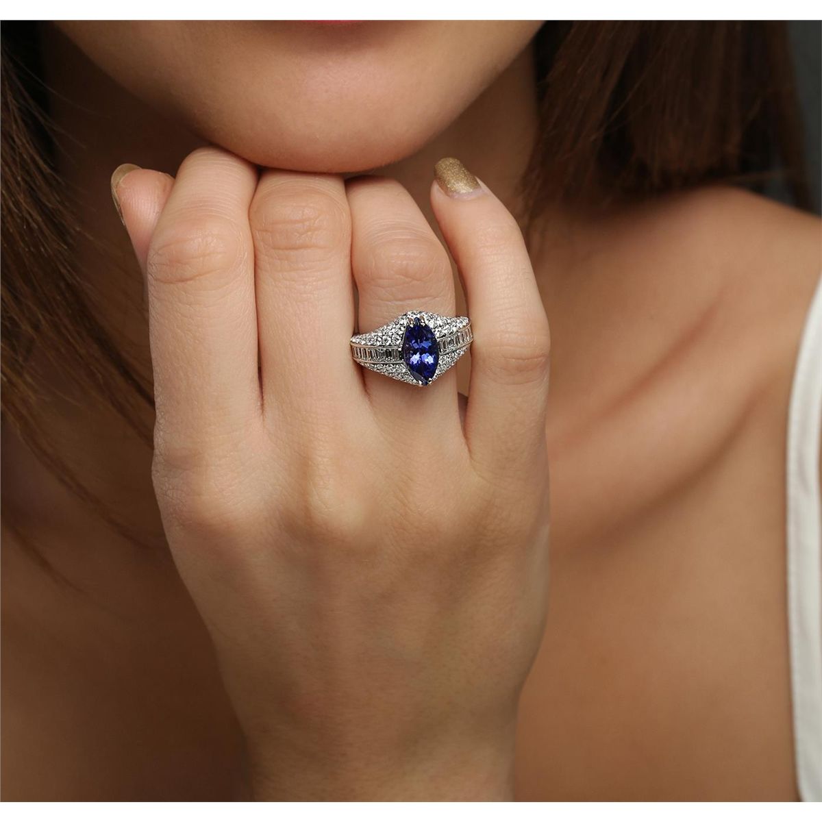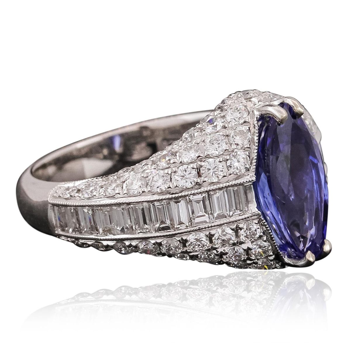 One electronically tested 18KT white gold ladies combination cast & assembled prong set ring with a bright polish finish. Identified with markings of "750". Condition is new. Containing: One prong set marquise modified brilliant cut natural tanzanite, measuring 12.66 x 7.23 x 4.70mm, approximate weight of 2.74ct., clarity is eye clean, type I, medium dark, moderately strong, bluish violet color, (GIA bV 6/4), cut is good. Ninety-Four prong set round brilliant cut diamonds, measuring 1.60 - 1.60 x 0.96mm (depth est.) approximate total weight of 94 Stones = 1.54ct. Clarity: SI-1. Color: I, Cut is Good. Twenty-Two channel set baguette cut diamonds, measuring 2.00 x 1.50 x 1.28mm (depth est.) approximate total weight of 22 Stones = 0.92ct. Clarity: VS-2. Color: I, Cut is Good. Colored gemstones are presumed to have been subjected to commonly used enhancement processes. All diamonds and colored gemstones are graded in the mounting, unless otherwise stated. Total Weight of Colored Stones 2.74ct. Total Weight of Diamonds 2.46ct. Total Weight of Ring 7.20 grams. GGL Appraised at $12,940.00.