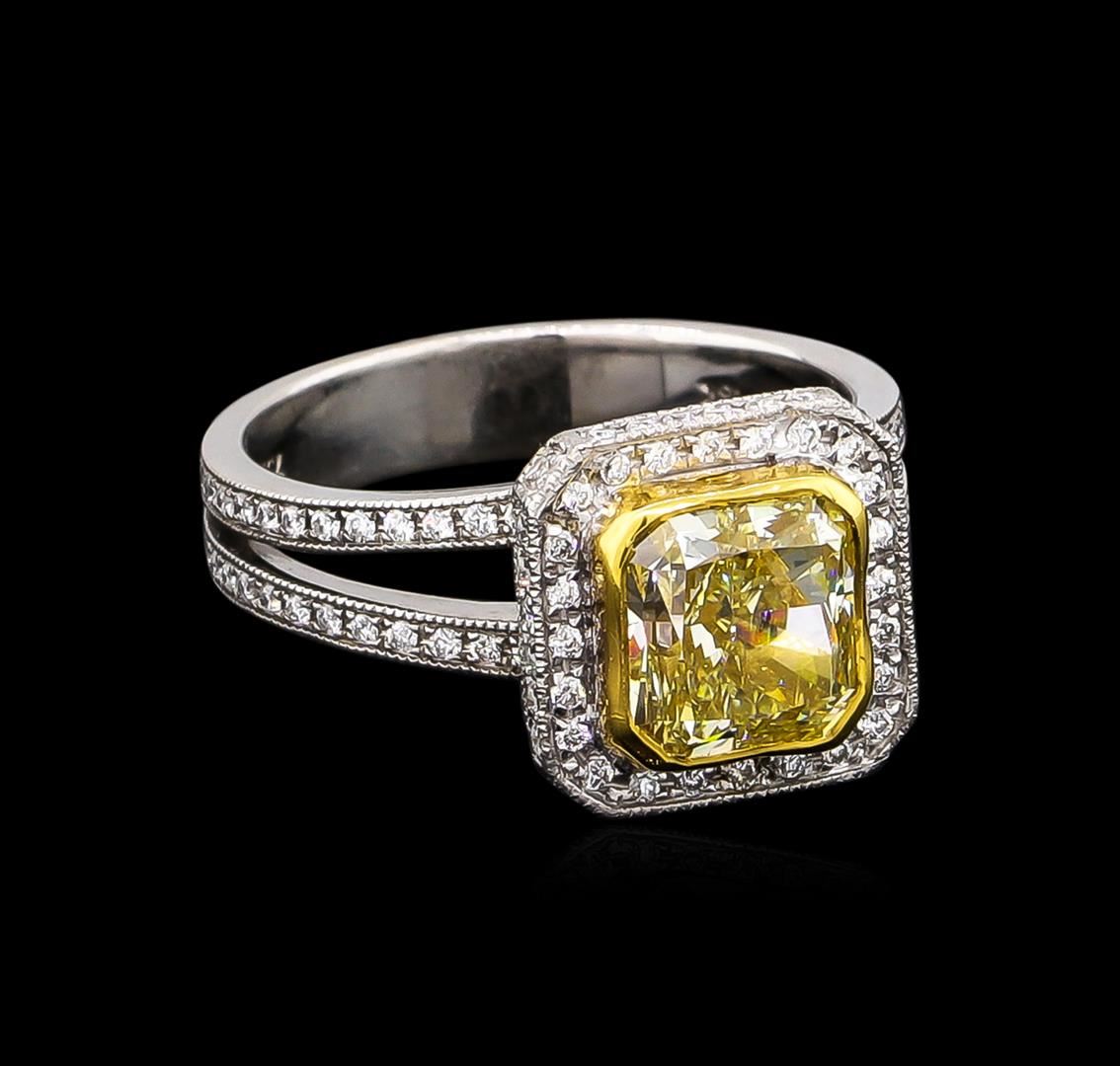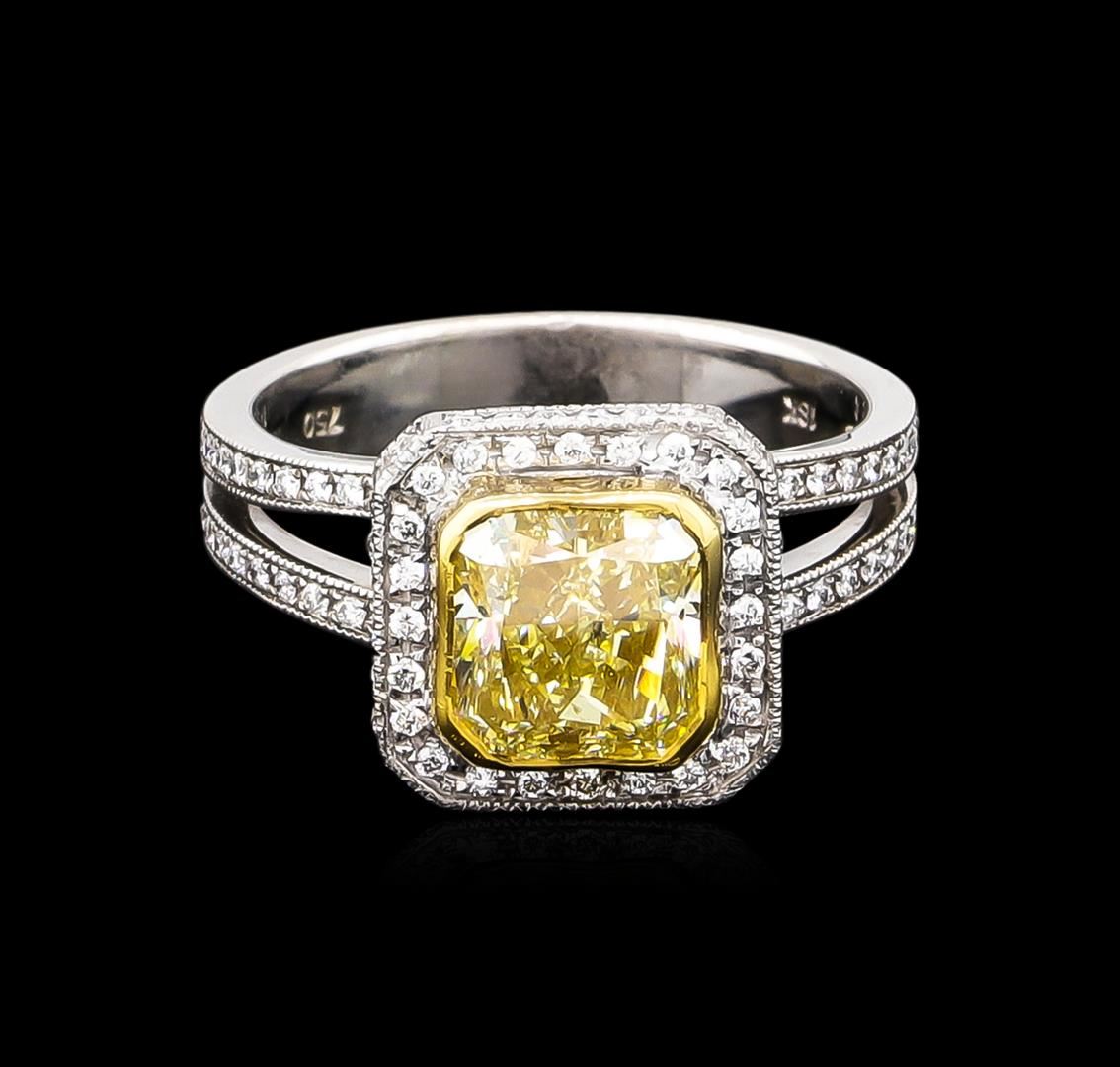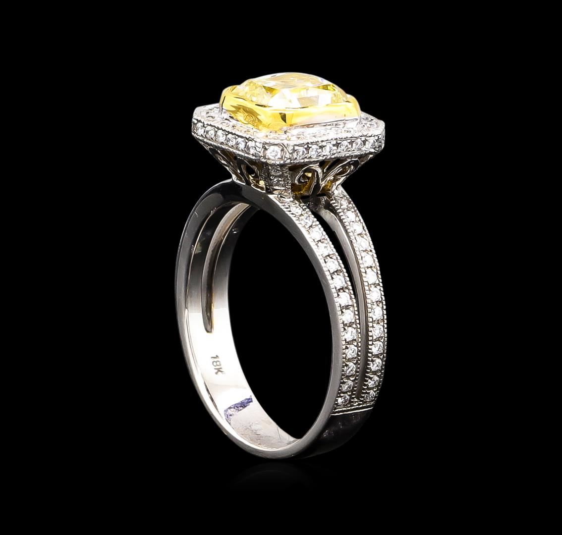 One electronically tested 18KT white gold ladies cast diamond ring with a bright polish finish with migraine detailing throughout. Condition is new, good workmanship. The featured diamond is mounted in an 18KT yellow gold accent basket, set within a diamond lattice gallery, supported by diamond set shoulders and completed by a four millimeter wide band. Identified with markings of "18K 750." Ring size is approximately 6.25. Total weight of diamonds is 2.75ct. Total weight of ring is 6.90gm. AIG Appraised at $34,600.00.