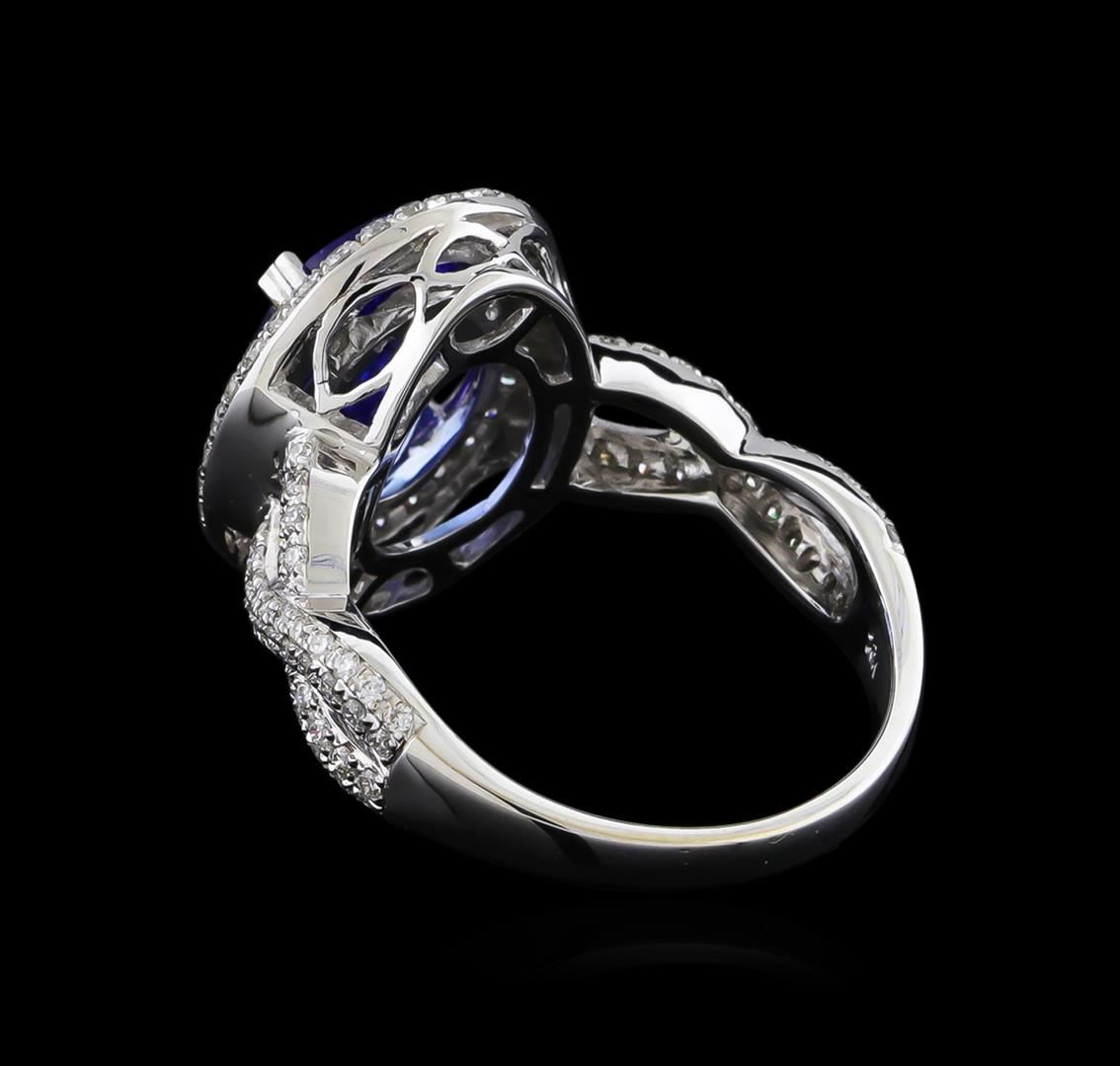 One electronically tested 18KT white gold ladies combination cast & assembled prong set ring with a split shank with a bright polish finish. Identified with markings of "750 18K". Condition is new. Containing: One prong set oval modified brilliant cut natural tanzanite, measuring 11.81 x 7.80 x 4.33mm, approximate weight of 2.79ct., clarity is eye clean, type I, medium light, very slightly grayish, violet color, (GIA V 4/3), cut is good. One Hundred Thirty-Five bead set round brilliant cut diamonds, measuring 1.00 - 1.00 x 0.60mm (depth est.) approximate total weight of 135 Stones = 0.59ct. Clarity: I-1 to I-2. Color: H - I, Cut is Good. All diamonds are graded in the mounting, unless otherwise stated, Colored gemstones are presumed to have been subjected to commonly used enhancement processes. Total Weight of Colored Stones 2.79ct. Total Weight of Diamonds 0.59ct. Total Weight of Ring 6.30 grams. GGL Appraised at $8,480.00.