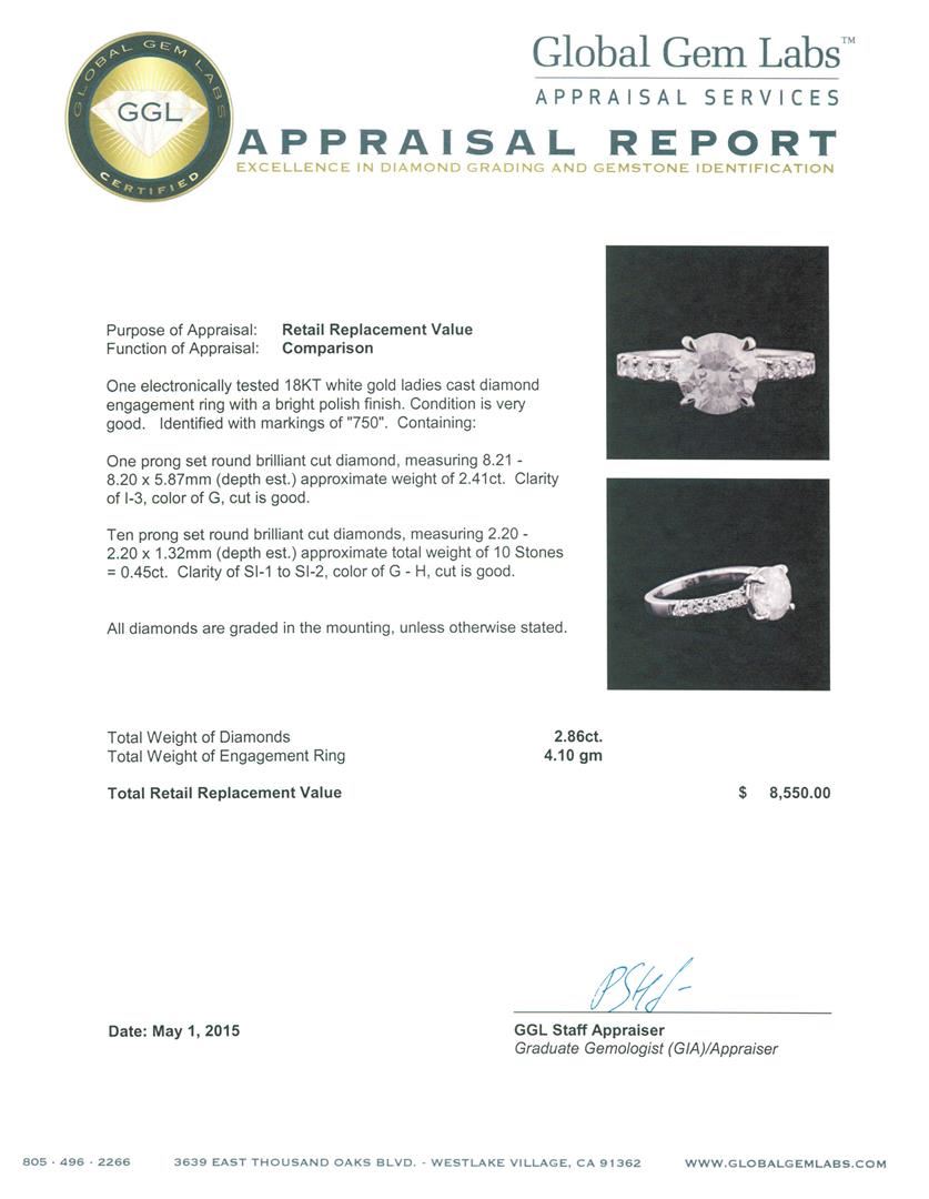 One electronically tested 18KT white gold ladies cast diamond engagement ring with a bright polish finish. Identified with markings of "750". Condition is very good. Containing: One prong set round brilliant cut diamond, measuring 8.21 - 8.20 x 5.87mm (depth est.) approximate weight of 2.41ct. Clarity: I-3. Color: G, Cut is Good. Ten prong set round brilliant cut diamonds, measuring 2.20 - 2.20 x 1.32mm (depth est.) approximate. Total Weight of 10 Stones = 0.45ct. Clarity: SI-1 to SI-2. Color: G - H, Cut is Good. All diamonds are graded in the mounting, unless otherwise stated. Total Weight of Diamonds 2.86ct. Total Weight of Engagement Ring 4.10 grams. GGL Appraised at $8,550.00.