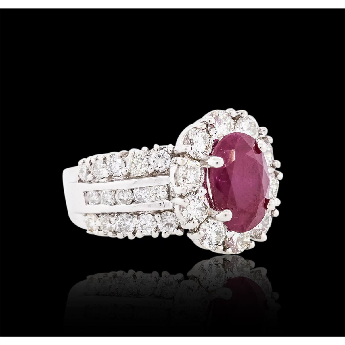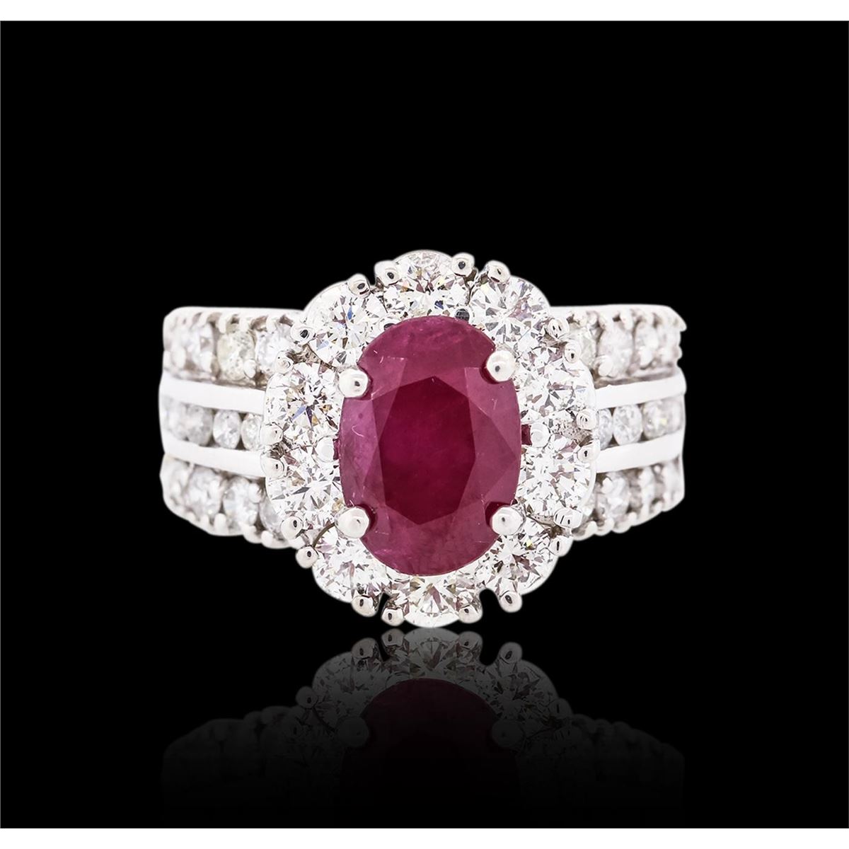 One electronically tested 18KT white gold ladies cast ruby and diamond ring with a bright polish finish. Identified with markings of "18K". Condition is new, good workmanship. Containing: One prong set oval mixed cut natural ruby, measuring 10.30 x 7.05 x 4.55mm, 6% bulge factor, approximate weight of 2.90ct., clarity is heavily included, type II, dark, very slightly brownish, red color, (GIA R 7/3), cut is good. Transmitting light somewhat diffusely, transparent to translucent. Naturally occurring internal & external characteristics are present. Indications of laboratory high temperature heat treatment, with flux additives. Graded in the setting. Ruby has a low tolerance to rhodium plating, repolishing the surface, & ultrasonic cleaning. Ten prong set round brilliant cut diamonds, measuring 3.40 - 3.30 x 2.01mm (depth est.) approximate total weight of 10 Stones = 1.47ct. Graded in the setting. Clarity SI-1 to SI-2. Color H - J. Thirty prong and channel set round brilliant cut diamonds, measuring 2.30 - 2.00 x 1.29mm (depth est.) approximate total weight of 30 Stones = 1.19ct. Graded in the setting. Clarity I-1 to I-2. Color G - I. Total Weight of Colored Stones 2.90ct. Total Weight of Diamonds 2.66ct. Total Weight of Ring 10.57 grams. AIG Appraised at $10,310.00.