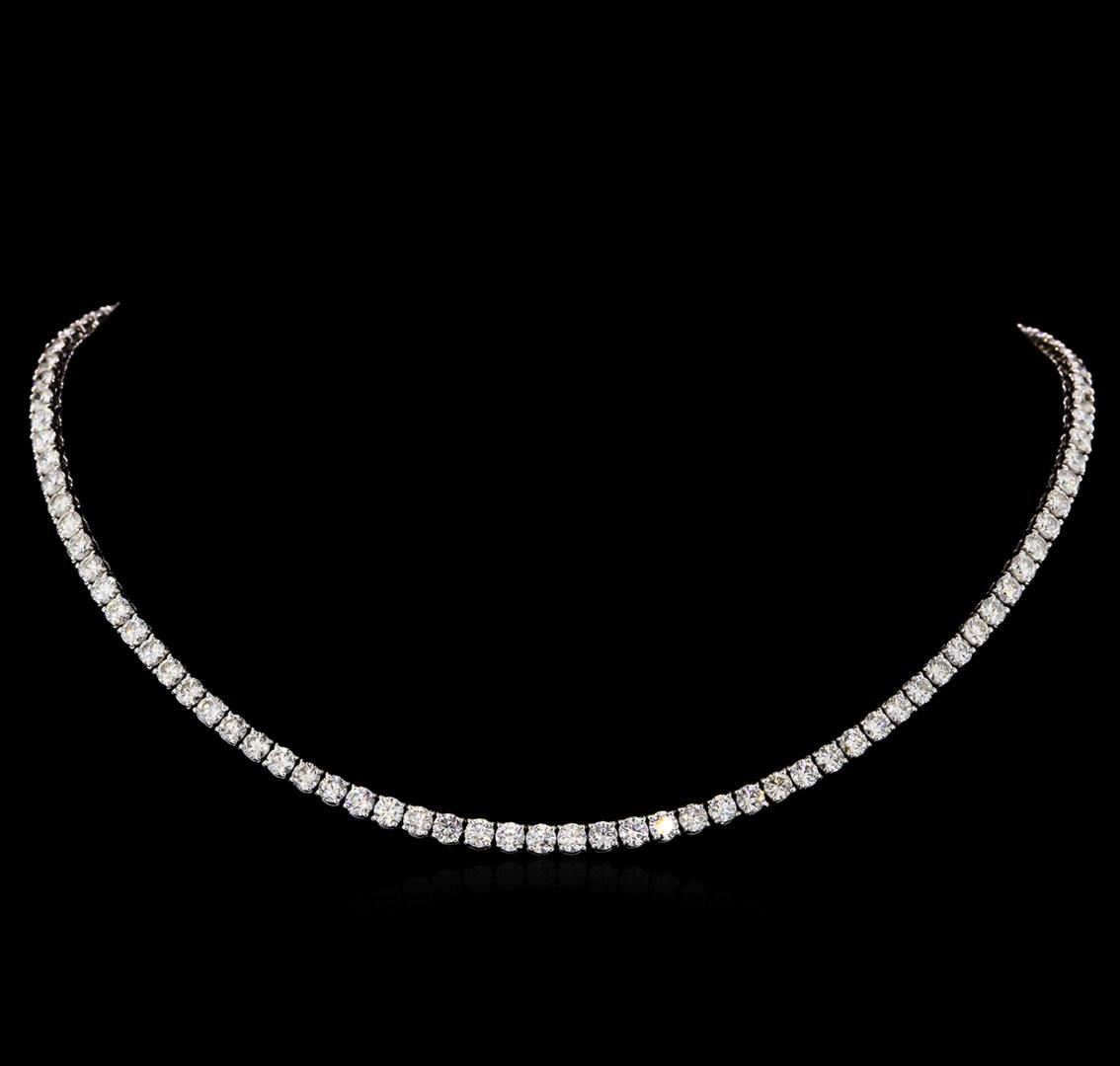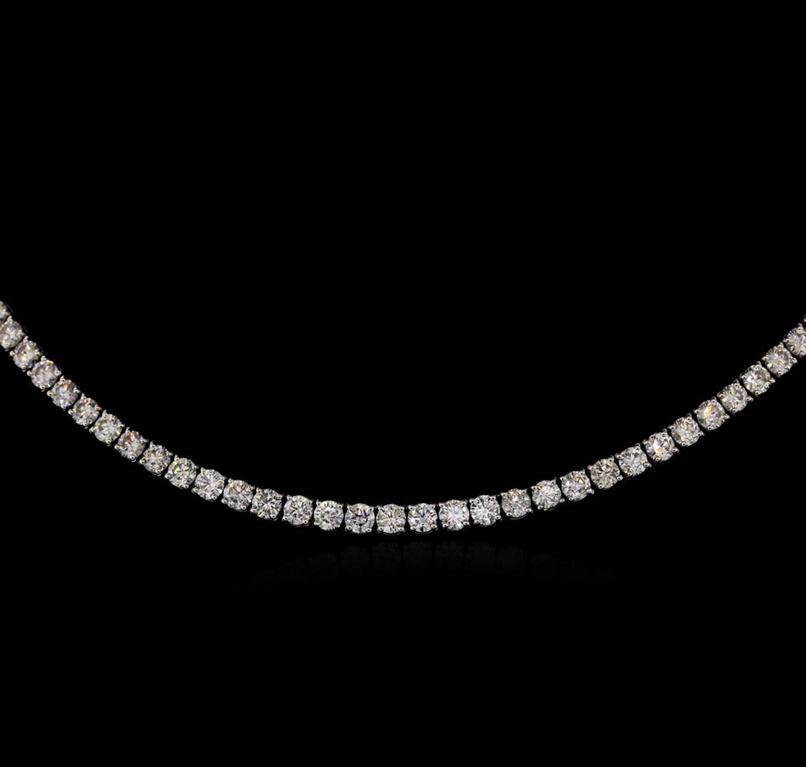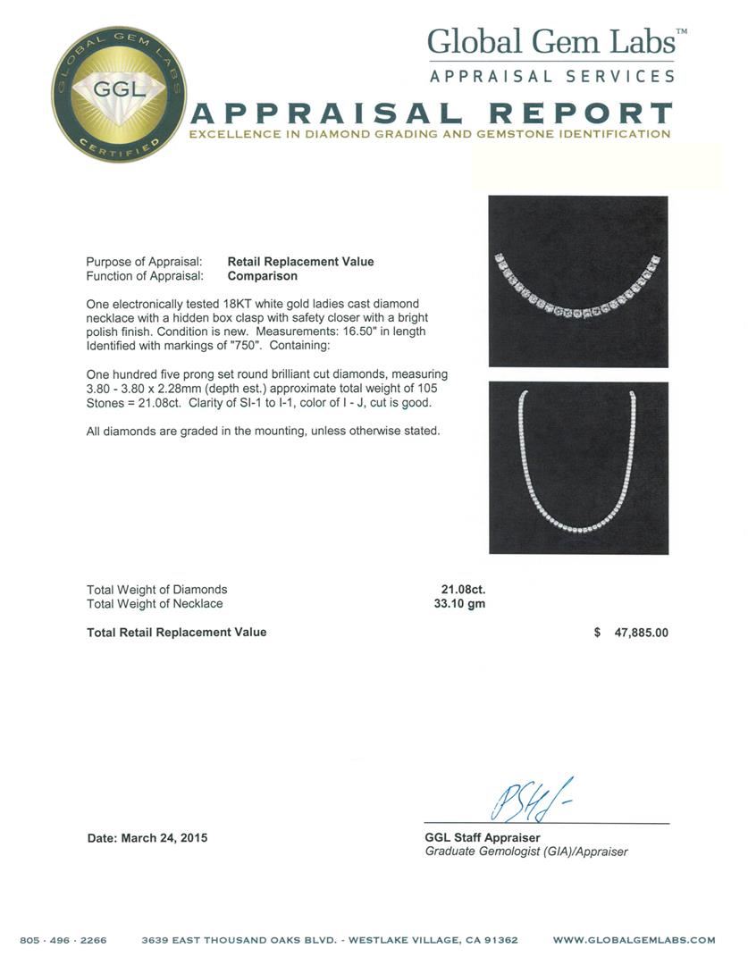 One electronically tested 18KT white gold ladies cast diamond necklace with a hidden box clasp with safety closer with a bright polish finish. Measurements: 16.50" in length Identified with markings of "750". Condition is new. Containing: One Hundred Five prong set round brilliant cut diamonds, measuring 3.80 - 3.80 x 2.28mm (depth est.) approximate total weight of 105 Stones = 21.08ct. Clarity: SI-1 to I-1. Color: I - J, Cut is Good. All diamonds are graded in the mounting, unless otherwise stated. Total Weight of Diamonds 21.08ct. Total Weight of Necklace 33.10 grams. GGL Appraised at $47,885.00.