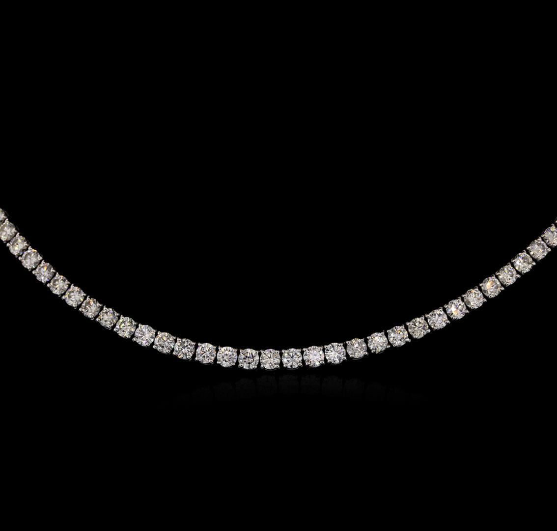 One electronically tested 18KT white gold ladies cast diamond necklace with a hidden box clasp with safety closer with a bright polish finish. Measurements: 16.50" in length Identified with markings of "750". Condition is new. Containing: One Hundred Five prong set round brilliant cut diamonds, measuring 3.80 - 3.80 x 2.28mm (depth est.) approximate total weight of 105 Stones = 21.08ct. Clarity: SI-1 to I-1. Color: I - J, Cut is Good. All diamonds are graded in the mounting, unless otherwise stated. Total Weight of Diamonds 21.08ct. Total Weight of Necklace 33.10 grams. GGL Appraised.