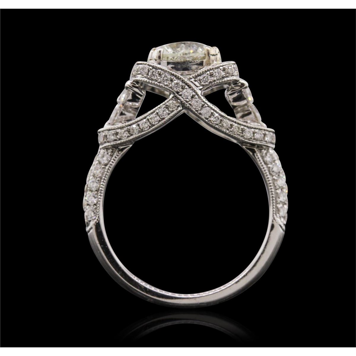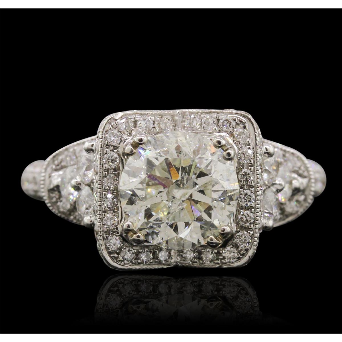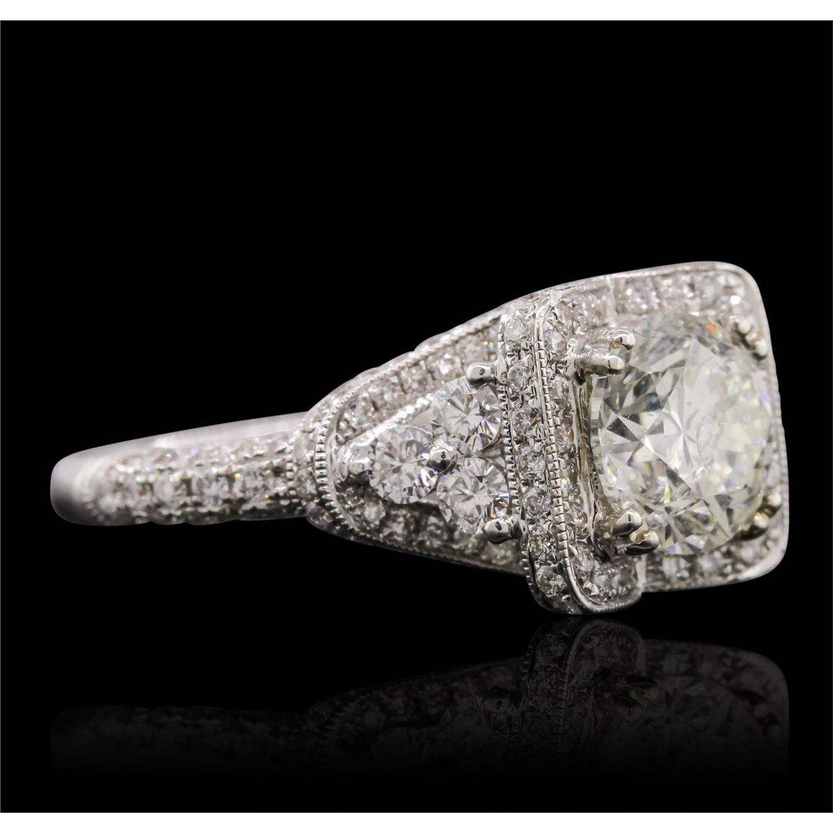 One electronically tested 18KT white gold Ladies combination cast & assembled engagement ring with a bright polish finish. Condition is new. Identified with markings of "18K". Containing: One prong set round brilliant cut diamond, measuring 7.70 - 7.60 x 5.00mm (depth est.) approximate weight of 1.79ct. Clarity: I-1. Color: L, Cut is Good. Six prong set round brilliant cut diamonds, measuring 2.40 - 2.40 x 1.44mm (depth est.) approximate. Total Weight of 6 Stones = 0.30ct. Clarity: SI-2. Color: H - I, Cut is Good. One Hundred Forty-Six bead set round brilliant cut diamonds, measuring 1.20 - 1.20 x 0.72mm (depth est.) approximate. Total Weight of 146 Stones = 0.92ct. Clarity: I-1. Color: H - I, Cut is Good. Total Weight of Diamonds 3.01ct. Total Weight of Engagement Ring 7.30 grams. GGL Appraised at $31,765.00.