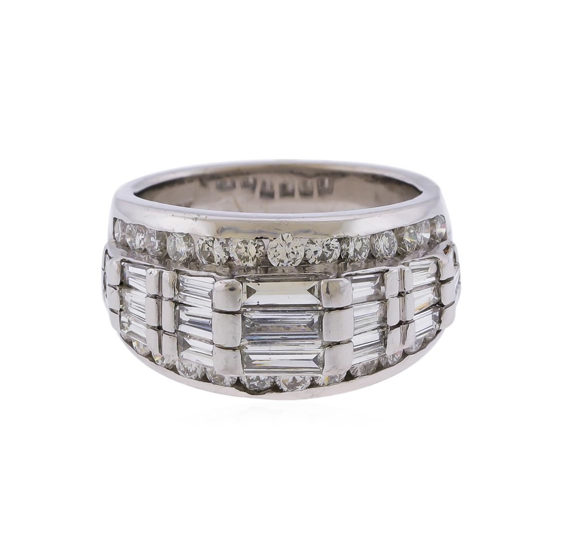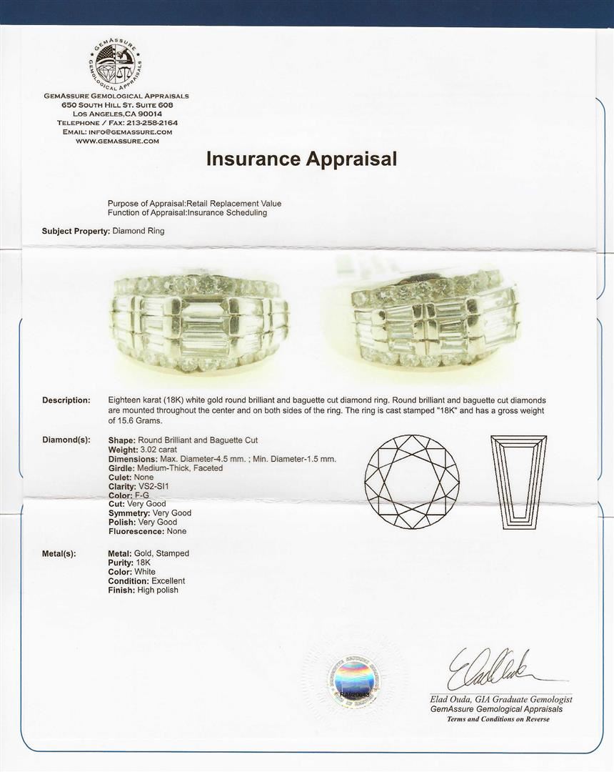 Eighteen karat 18K) white gold round brilliant and baguette cut diamond ring. Round brilliant and baguette cut diamonds, weighing approximately 3.02ctw with an average clarity of VS2-SI1 and an average color of F-G, are mounted throughout the center and on both sides of the ring. The ring is cast stamped "18k" and has a gross weight of 15.6 grams. GGA Appraised.