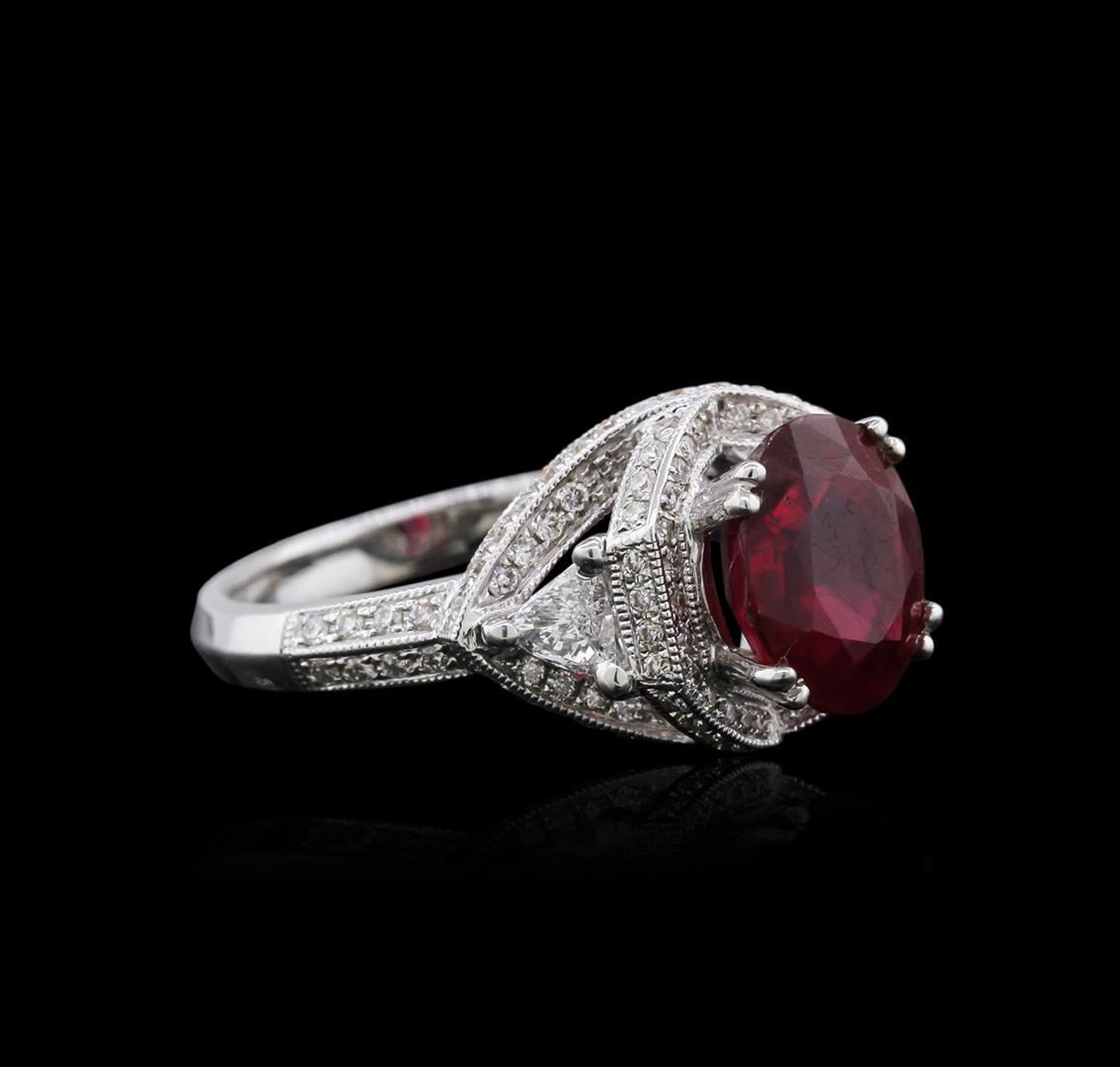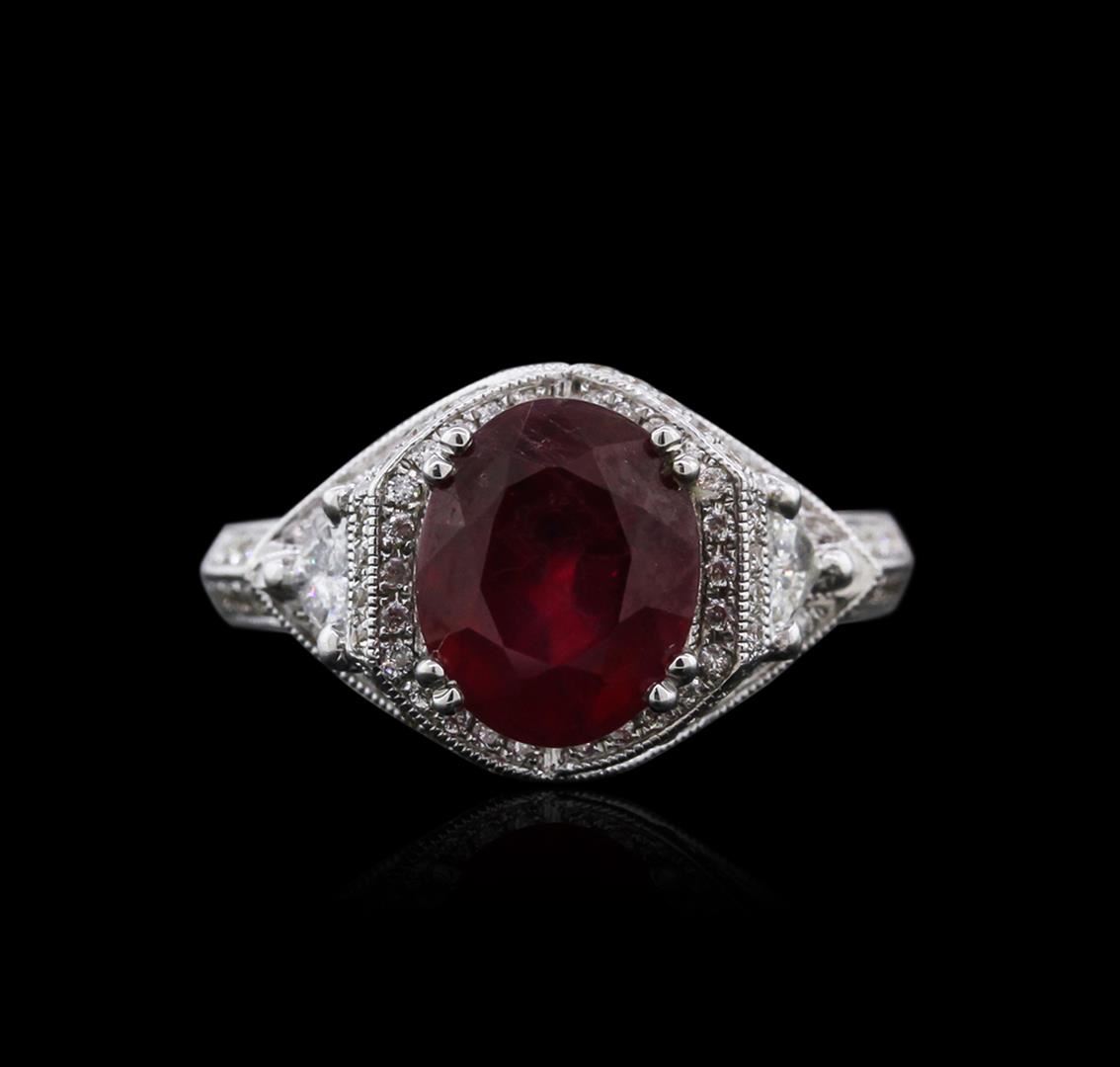 One electronically tested 18KT white gold ladies cast ruby and diamond ring with a bright polish finish. Identified with markings of "18K". Condition is new. Containing: One prong set oval modified brilliant cut natural ruby, measuring 9.70 x 7.50 x 4.88mm, approximate weight of 3.02ct., clarity is heavily included, medium dark, very slightly brownish, strongly purplish red color, (GIA stpR 6/3), cut is good. Ninety-Two prong set round brilliant cut diamonds, measuring 1.20 - 1.20 x 0.72mm (depth est.) approximate total weight of 92 Stones = 0.58ct. Clarity: I-1 to I-2. Color: H - I, Cut is Good. Two prong set triangle cut diamonds, measuring 3.20 x 3.20 x 1.98mm (depth est.) approximate total weight of 2 Stones = 0.23ct. Clarity: SI-1. Color: H - I, Cut is Good. Colored gemstones are presumed to have been subjected to commonly used enhancement processes. All diamonds and colored gemstones are graded in the mounting, unless otherwise stated. Total Weight of Colored Stones 3.02ct. Total Weight of Diamonds 0.81ct. Total Weight of Ring 7.10 grams. GGL Appraised at $5,030.00.
